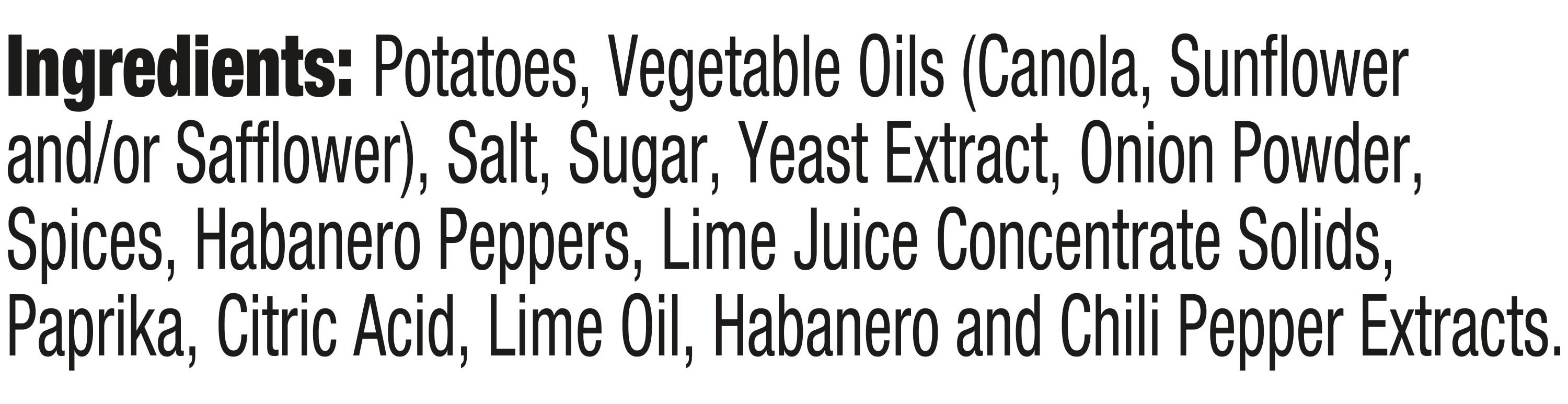 Ingredients: VEGETABLE OILS (CANOLA, SUNFLOWER AND/OR SAFFLOWER), SALT, SUGAR, YEAST EXTRACT, ONION POWDER, SPICES, HABANERO PEPPERS, LIME JUICE CONCENTRATE SOLIDS, PAPRIKA, CITRIC ACID, LIME OIL, HABANERO AND CHILI PEPPER EXTRACTS., POTATOES