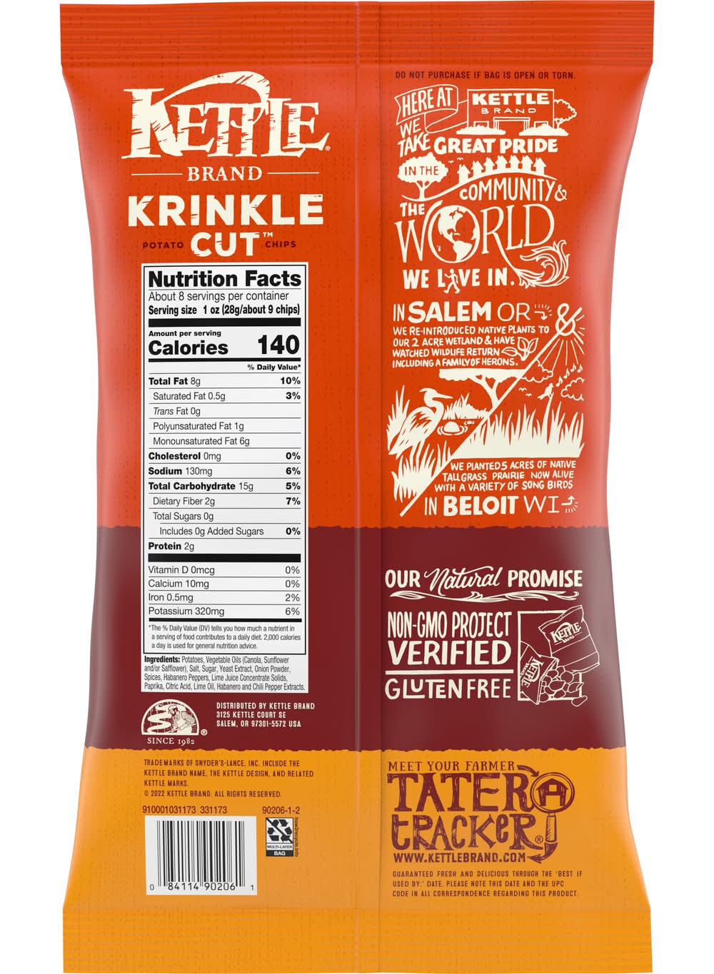 Kettle chips are sliced thicker than our classic for an extra crunch. And their deep ridges hold all the extreme seasoning they need. Our habanero lime chips deliver a true taste adventure with a blend of spicy pepper and zesty citrus. On top of that, So go ahead, experience the power of the crunch and the spicy flavor by eating them straight out of the bag. It takes pretty high standards to achieve Kettle Brand chips’ amazing taste. When you open a bag of kettle chips, you know you’re getting incredible quality made with authentic recipes by real people who take real care with what they do. • Flavor: Habanero lime • Packaging: Reusable