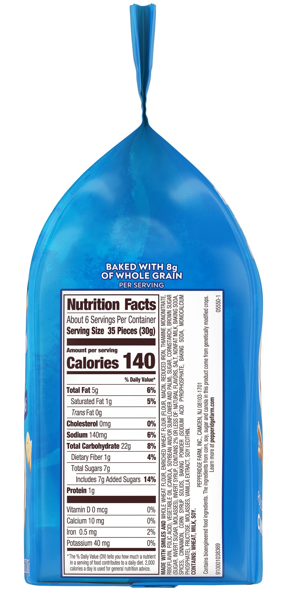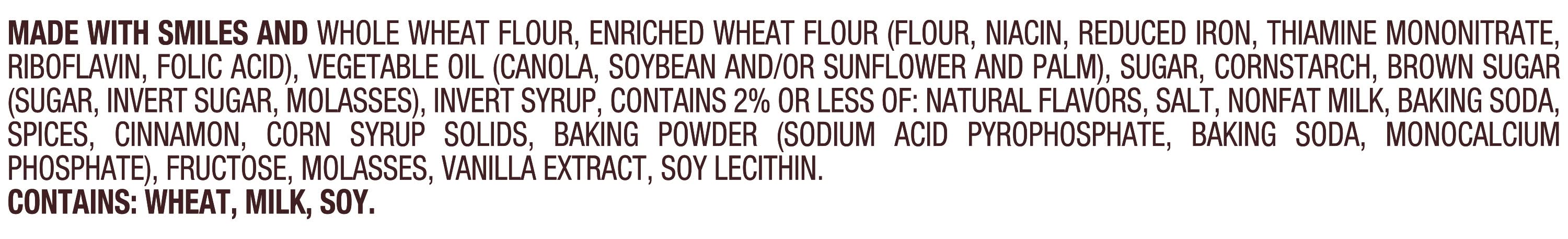 Ingredients: MADE WITH SMILES AND WHOLE WHEAT FLOUR, ENRICHED WHEAT FLOUR (FLOUR, NIACIN, REDUCED IRON, THIAMINE MONONITRATE, RIBOFLAVIN, FOLIC ACID), VEGETABLE OIL (CANOLA, SOYBEAN AND/OR SUNFLOWER AND PALM), SUGAR, CORNSTARCH, BROWN SUGAR (SUGAR, INVERT SUGAR, MOLASSES), INVERT SYRUP, CONTAINS 2% OR LESS OF: NATURAL FLAVORS, SALT, NONFAT MILK, BAKING SODA, SPICES, CINNAMON, CORN SYRUP SOLIDS, BAKING POWDER (SODIUM ACID PYROPHOSPHATE, BAKING SODA, MONOCALCIUM PHOSPHATE), FRUCTOSE, MOLASSES, VANILLA EXTRACT, SOY LECITHIN. CONTAINS: WHEAT, MILK, SOY. Contains: CONTAINS: Gluten, Milk/Dairy, Soybean, Wheat