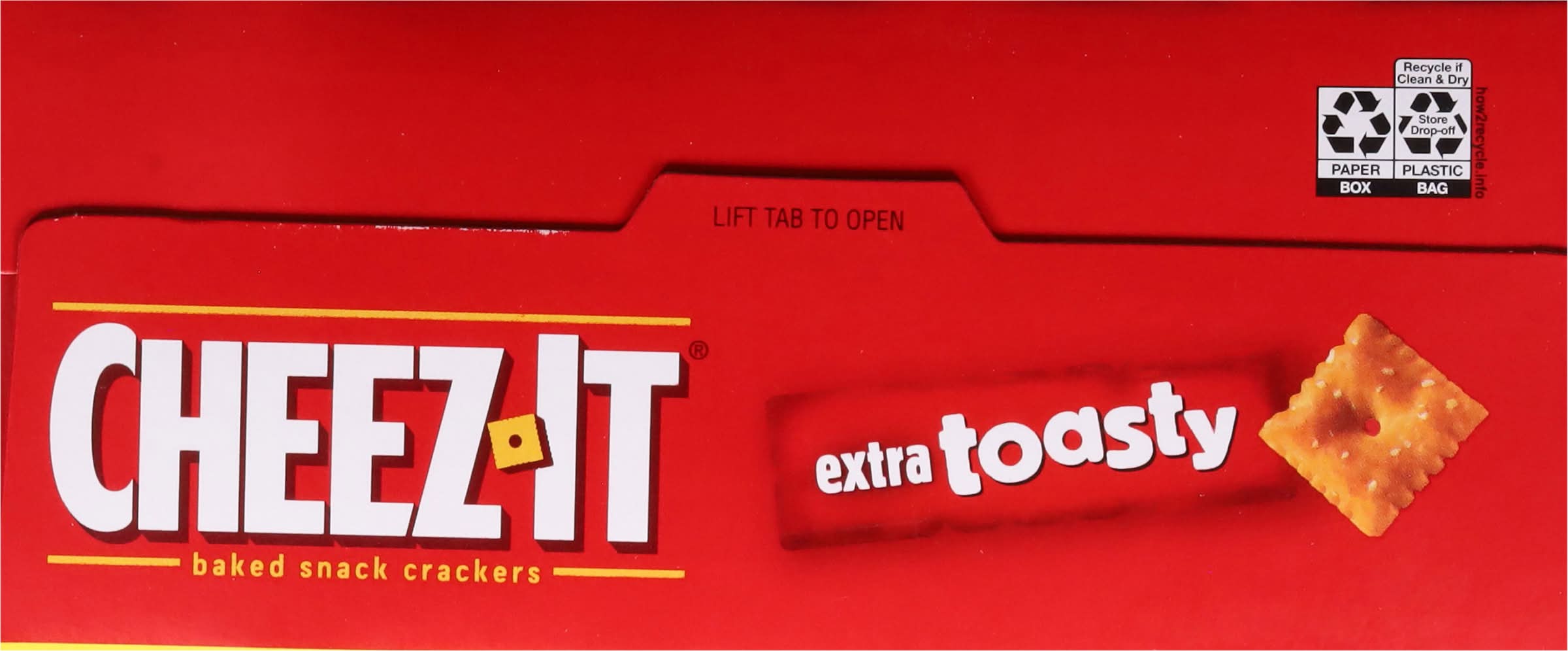 Outrageously cheesy and ridiculously craveable, cheese-lovers reach for Cheez-It Extra Toasty baked snack crackers by the handfuls. Discover a crowd favorite snack made with 100% real cheese baked extra toasty for an irresistible, crunchy snap in every bite. Each lightly salted crisp is loaded with bold cheesy flavor. Cheez-It baked snack crackers are a fan favorite for school snacks, video game snacks, late-night snacking, road trips, and so much more, the cheesy options are endless; Go ahead and grab a box of Cheez-It fans' favorite flavor that’ll keep you coming back for more. Enjoy a cheesy, satisfying crunch whenever you crave a box of your favorite Cheez-It crackers. Show up to a party with Cheez-It Extra Toasty crackers and watch as these crowd-favorites are devoured one by one. Deliciously cheesy, light and crispy, you’ll love that one of a kind toasted, crunch in every delectable bite of Cheez-It Extra Toasty baked snack crackers. • Kellogg Sales Co., Battle Creek,mi,49016 • Packaging: Reusable