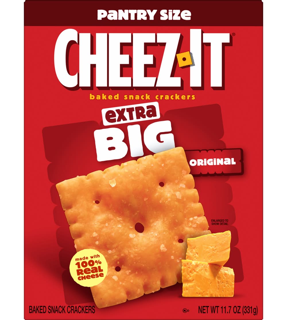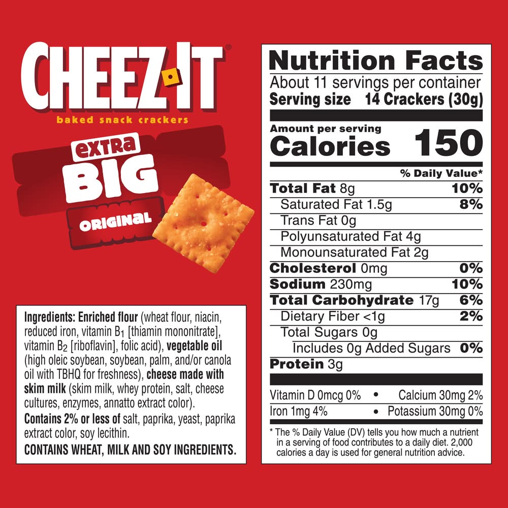 Outrageously cheesy and ridiculously craveable, Cheez-It Extra Big baked snack crackers are deliciously crunchy mega-sized crackers that have captured cheese-lovers for decades. Discover a crowd-favorite snack made with 100% real cheese baked to crispy perfection for an irresistible taste in every crunchy bite. Each lightly salted cracker is made extra big and loaded with a burst of cheesy flavor; Cheez-It baked snack crackers are a fan-favorite for game night, school snacks, family movie nights, party spreads, late-night snacking, and so much more, the cheesy options are endless. Delicious for all ages, grab a box of Cheez-It Extra Big crackers for every family snacking moment. Whether you're packing them in school lunches, grabbing some for the office, or taking along on a road trip, you'll find a delicious, crisp snack that is filled with big cheese flavor. It’s no wonder that these crackers have become a crowd-favorite, bringing smiles and that urge for just one more handful. Kelloggs, Battle Creek,MI,49016