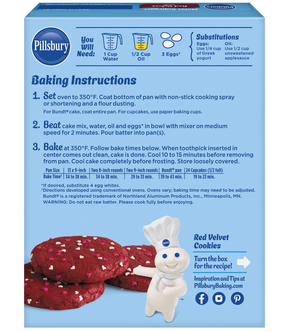 Directions: all you need: 1 cup water; 1/2 cup oil; 3 eggs (if desired, substitute 4 egg whites or 1/2 cup egg substitute for the eggs). substitutions: eggs: use 1/4 cup of greek yogurt or oil: use 1/2 cup unsweetened applesauce. baking instructions: 1. set oven to 350 degrees f. coat bottom of pan with no-stick cooking spray or shortening and a flour dusting. for bundt cake, coat entire pan. for cupcakes, use paper baking cups. 2. beat cake mix, water, oil and eggs (if desired, substitute 4 egg whites or 1/2 cup egg substitute for the eggs) in bowl with mixer on medium speed for 2 minutes. pour batter into pan(s). 3. bake at 350 degrees f. follow the bake times below. when toothpick inserted in the center comes out clean, cake is done. cool 10 to 15 minutes before removing from pan. cool cake completely before frosting. store loosely covered. pan size: 13 x 9-inch; bake time (directions developed using conventional ovens. ovens vary; baking time may need to be adjusted): 34 to 38 min. pan size: two 8-inch rounds; bake time (directions developed using conventional ovens. ovens vary; baking time may need to be adjusted): 34 to 38 min. pan size: tow 9-inch rounds; bake time (directions developed using conventional ovens. ovens vary; baking time may need to be adjusted): 29 to 33 min. pan size: bundt pan; bake time (directions developed using conventional ovens. ovens vary; baking time may need to be adjusted): 39 to 43 min. pan size: 24 cupcakes (1/2 full); bake time (directions developed using conventional ovens. ovens vary; baking time may need to be adjusted): 19 to 23 min.
