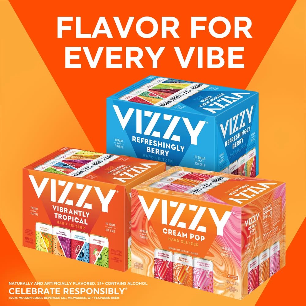 Kick the fun up a notch with these refreshing spiked seltzers inspired by your favorite frozen treats! The Vizzy Cream Pop Hard Seltzer Variety Pack features vibrant dual flavors with 5.0% ABV. Three nostalgic blends are included: 6 cans of Orange Cream Pop, 3 cans of Raspberry Cream Pop and 3 cans of Strawberry Cream Pop. Leading with a refreshing orange, raspberry or strawberry flavor balanced with a creamy vanilla finish, these gluten free hard seltzers contain less than 1 gram of sugar and 100 calories. Enjoy these slightly sweet flavored malt beverages with salty snacks for a nice contrast to the creamy fruit flavors. They pair perfectly with all your favorite outdoor activities like pickleball, golf and beach days, or with more laid back activities like getting together with friends, family barbecues or anytime you feel like savoring a crisp, refreshing spin on a classic favorite. Pick up a 12 pack of 12.0 fl oz cans today, and enjoy these delicious Vizzy flavors that are bursting with refreshment. • Flavor: Raspberry-orange-strawberry • Pack size: 12 • Alcohol by volume: 5%