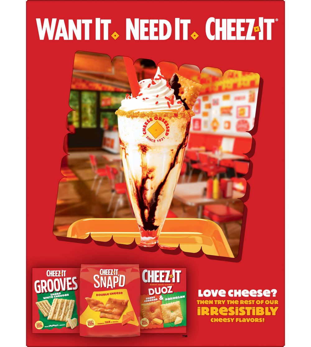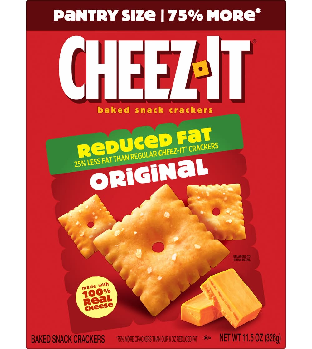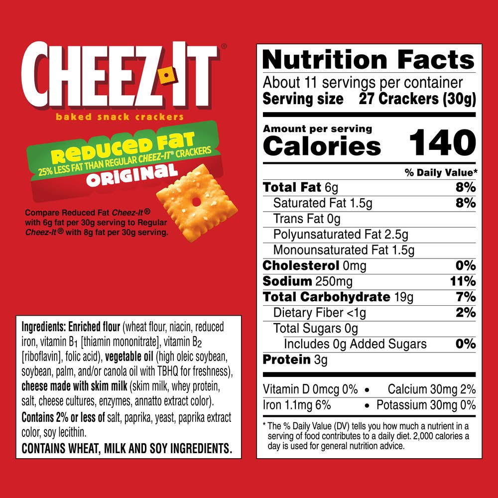 Feel good about satisfying your snack cravings with Cheez-It Reduced Fat Original Baked Snack Crackers - bite-size cheese crackers that are baked with 25% less fat than Cheez-It Original crackers* (*compare Reduced Fat Cheez-It with 6g fat per 30g serving to Regular Cheez-It with 8g fat per 30g serving). Cheez-It Reduced Fat Original Baked Snack Crackers are the real deal - made with 100% real cheese that's been carefully aged for a yummy, irresistible taste. Each perfect square is bursting with bold, cheesy flavor that hits your taste buds with every crunchy mouthful. A baked snack, Cheez-It crackers are perfect for game time, party spreads, school lunches, late-night snacking and more - the cheesy options are endless. Go ahead and enjoy the satisfying goodness of your favorite, trimmed-down cheesy bite. You'll love the feel-good flavor of real cheese in every tasty handful of Cheez-It Reduced Fat Original Baked Snack Crackers. • Flavor: Real cheese • Packaging: Reusable