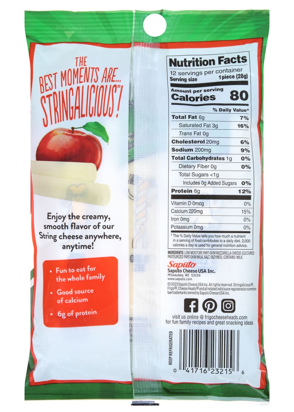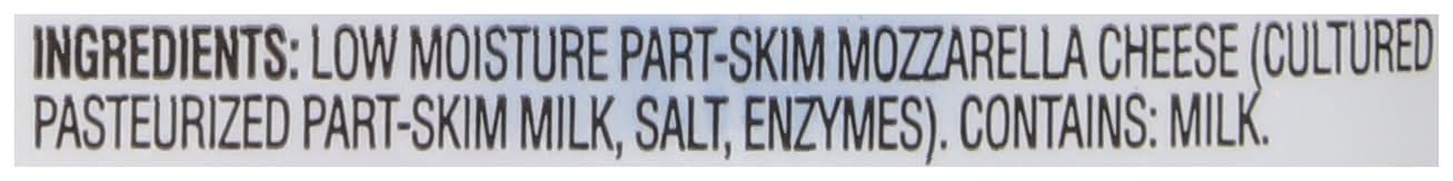 Ingredients: Low Moisture Part-Skim Mozzarella Cheese (Cultured Pasteurized Part-Skim Milk, Salt, Enzymes) Contains: Milk