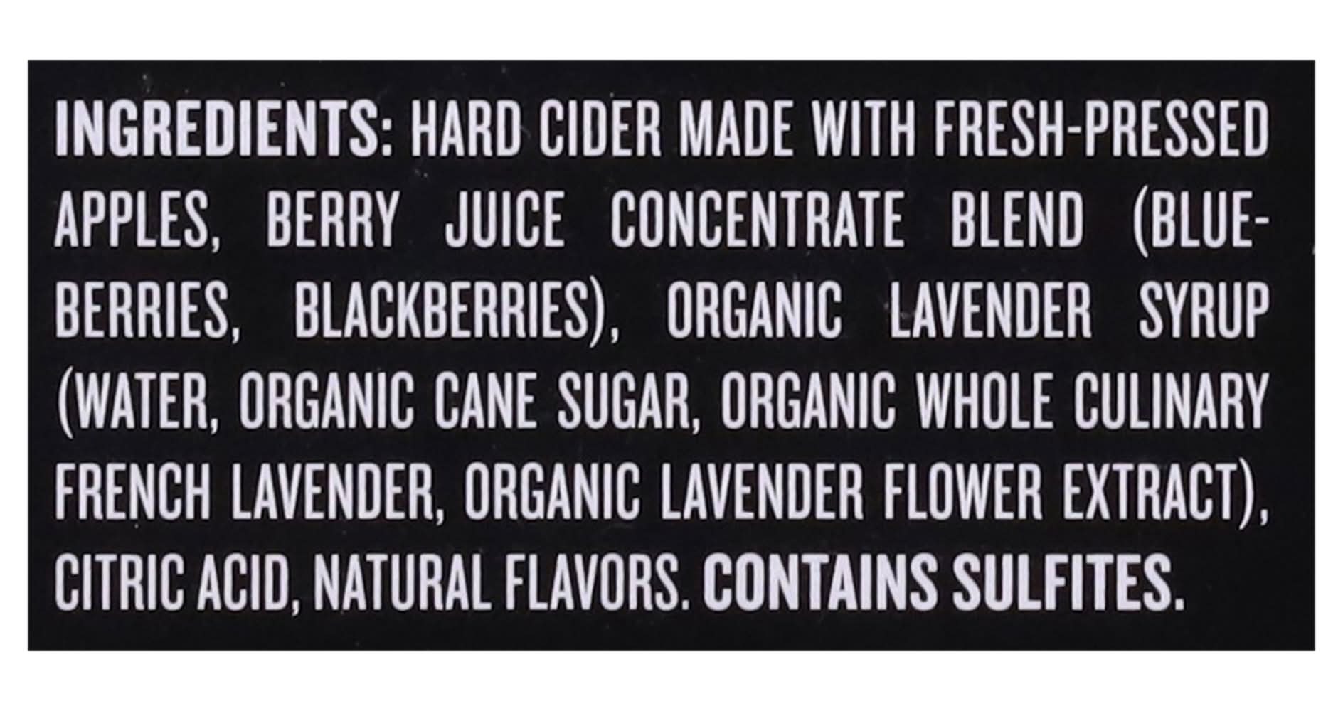 Ingredients: Hard Cider Made with Fresh-Pressed Apples, Berry Juice Concentrate Blend (Blue-Berries, Blackberries), Organic Lavender Syrup (Water, Organic Cane Sugar, Organic Whole Culinary French Lavender, Organic Lavender Flower Extract), Citric Acid, Natural Flavors Contains: Sulfites
