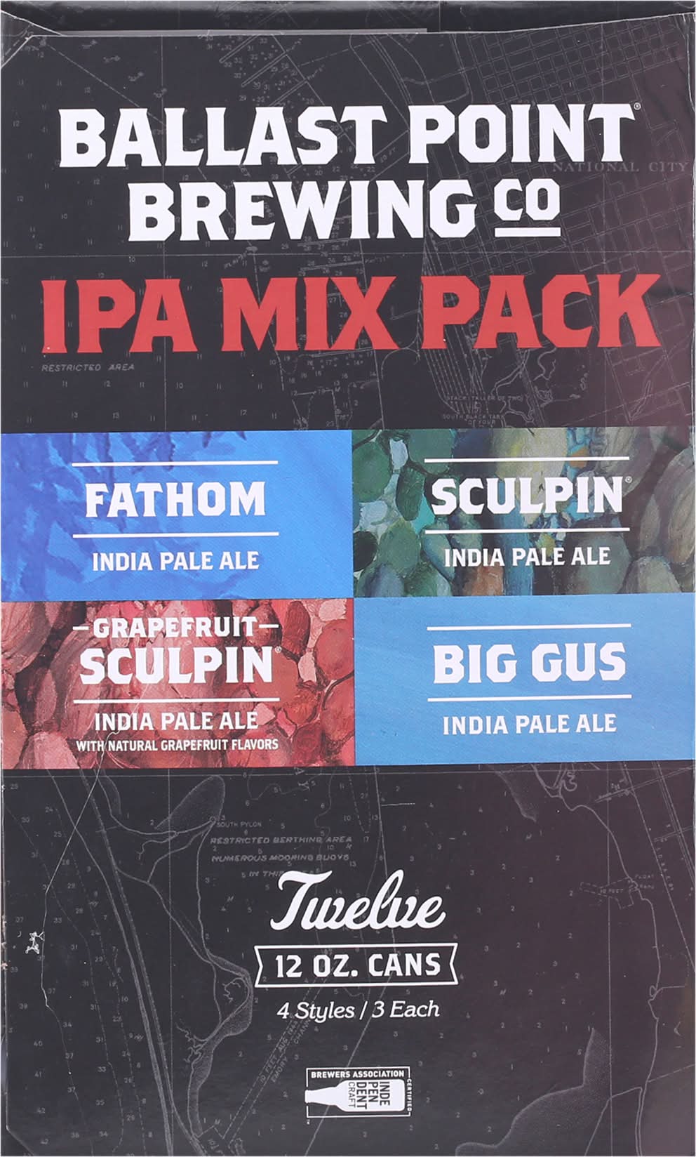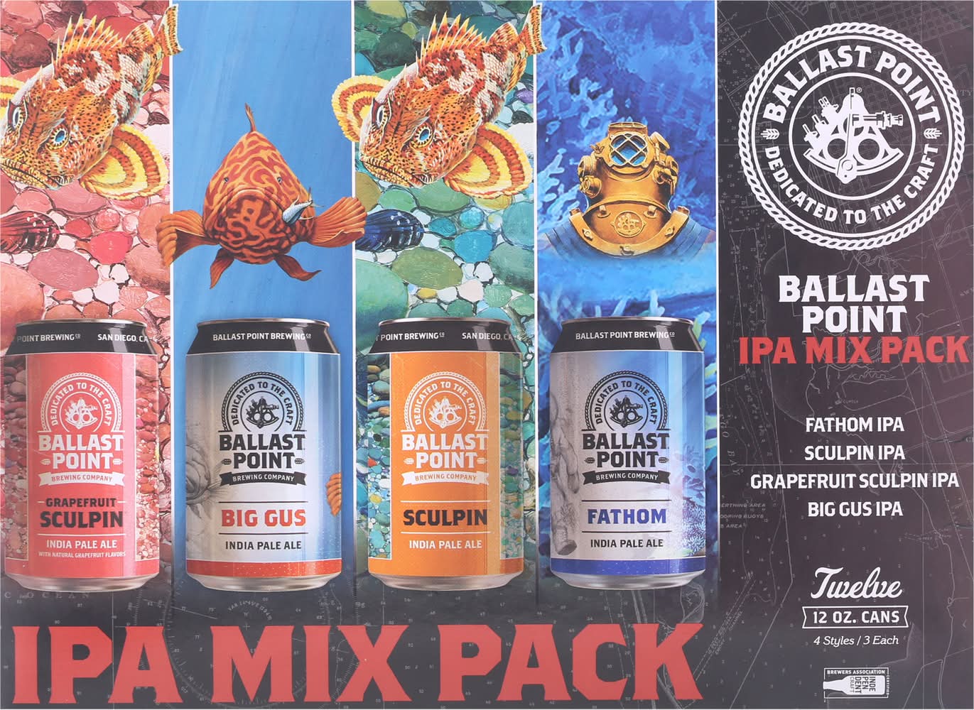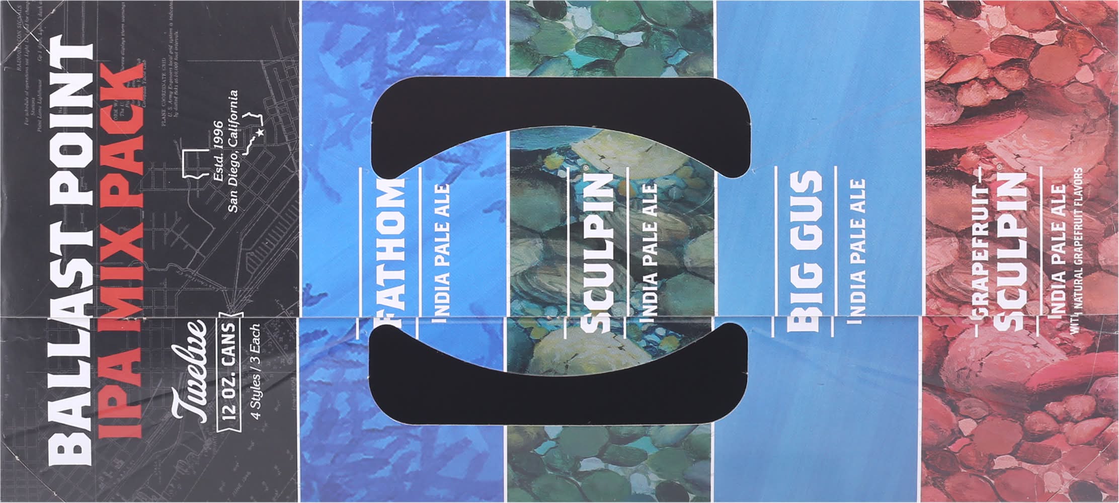 Grapefruit Sculpin: India pale ale with natural grapefruit flavors. Estd. 1996 San Diego, California. Fathom: A crisp IPA with just the right amount of depth. An easy drinking West Coast IPA with notes of fresh pine, orange, and tangerine, backed by cracker and toffee. Sculpin: A trophy beer that's a testament to our homebrew roots. Our award-winning IPA that packs a bit of a sting, just like a sculpin fish. Grapefruit Sculpin: A trophy beer that's a testament to our homebrew roots. Our award-winning IPA with a grapefruit inspired twist. Big Gus: The latest innovation: A clearly different IPA. Clear, hoppy, and incredibly dry, Big Gus is what happens when we swim away from the haze craze. Please explore responsibly. Over 300 quality checks from grain to glass. Brewers Association Certified Independent Craft. ballastpoint.com. Please recycle. • Flavor: Assorted • Pack size: 12 • Alcohol by volume: 6.3% • Packaging: Reusable