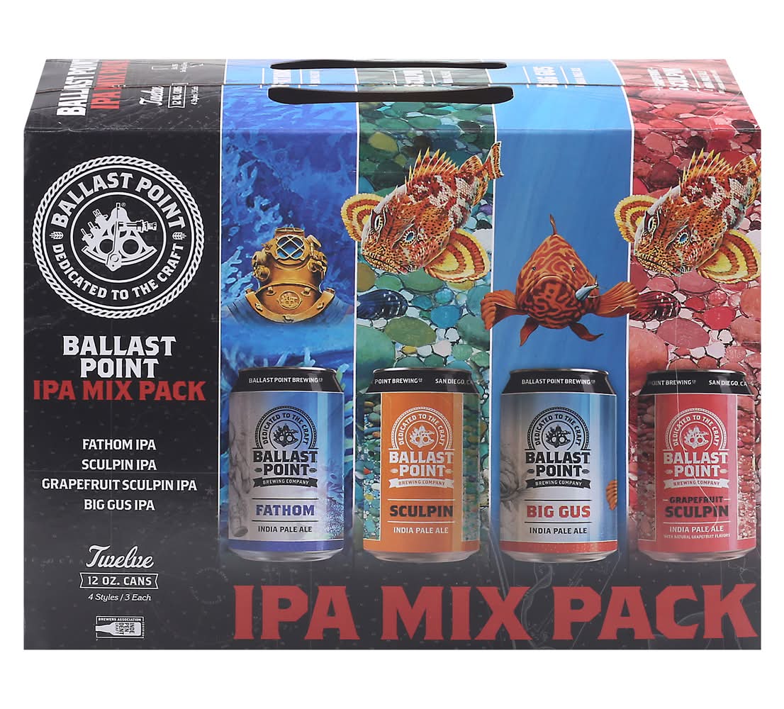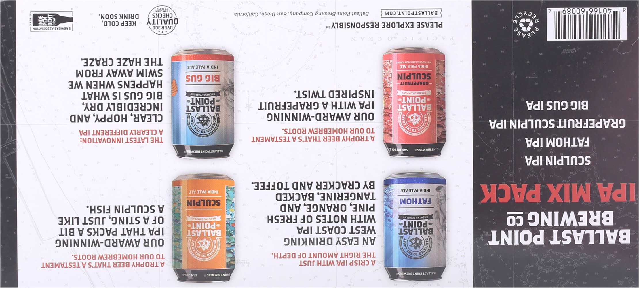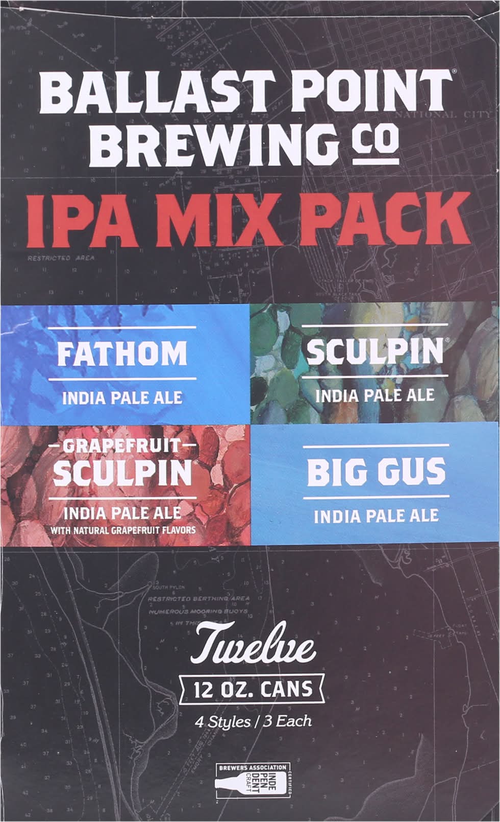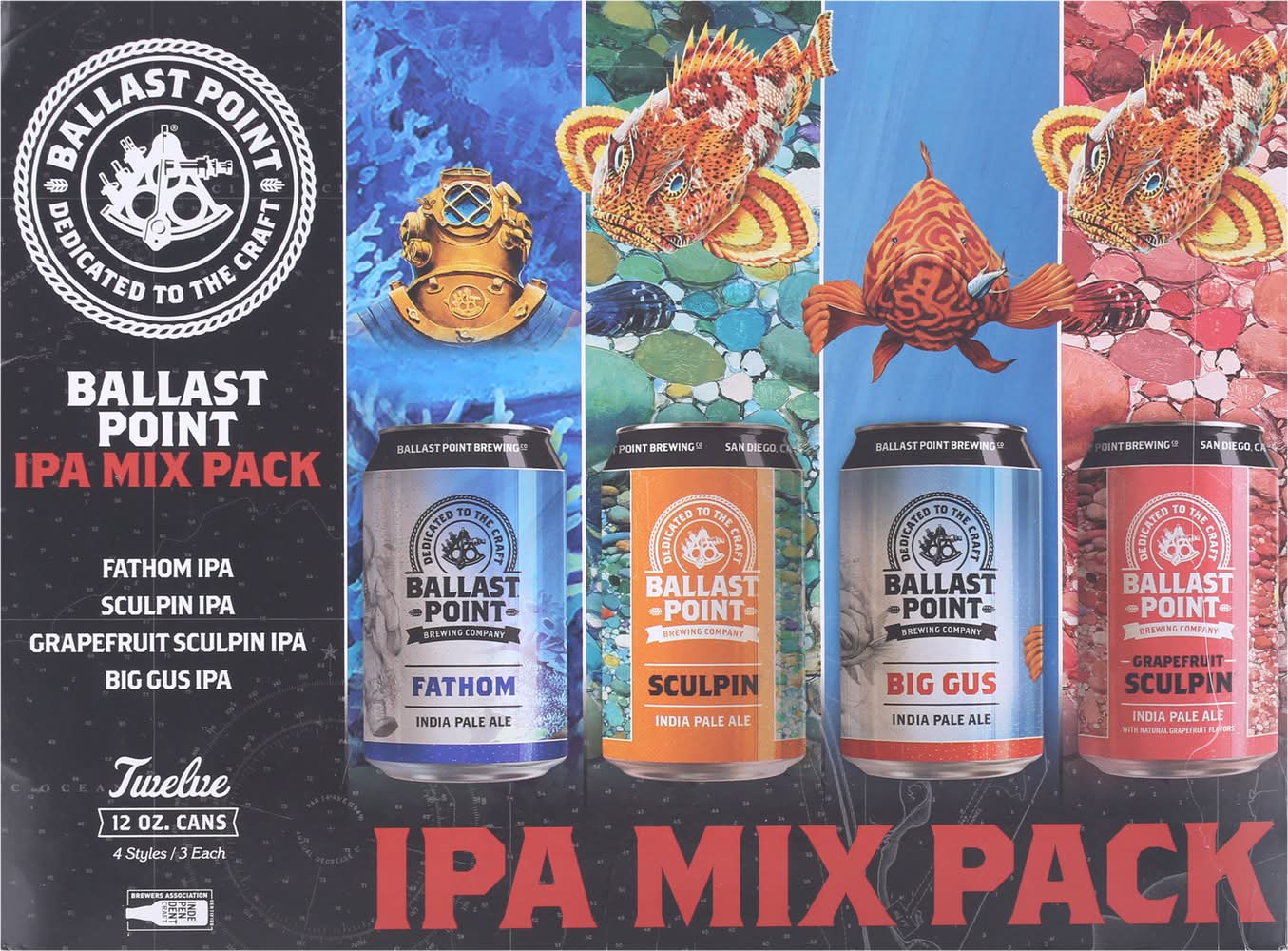 Grapefruit Sculpin: India pale ale with natural grapefruit flavors. Estd. 1996 San Diego, California. Fathom: A crisp IPA with just the right amount of depth. An easy drinking West Coast IPA with notes of fresh pine, orange, and tangerine, backed by cracker and toffee. Sculpin: A trophy beer that's a testament to our homebrew roots. Our award-winning IPA that packs a bit of a sting, just like a sculpin fish. Grapefruit Sculpin: A trophy beer that's a testament to our homebrew roots. Our award-winning IPA with a grapefruit inspired twist. Big Gus: The latest innovation: A clearly different IPA. Clear, hoppy, and incredibly dry, Big Gus is what happens when we swim away from the haze craze. Please explore responsibly. Over 300 quality checks from grain to glass. Brewers Association Certified Independent Craft. ballastpoint.com. Please recycle. • Flavor: Assorted • Pack size: 12 • Alcohol by volume: 6.3% • Packaging: Reusable