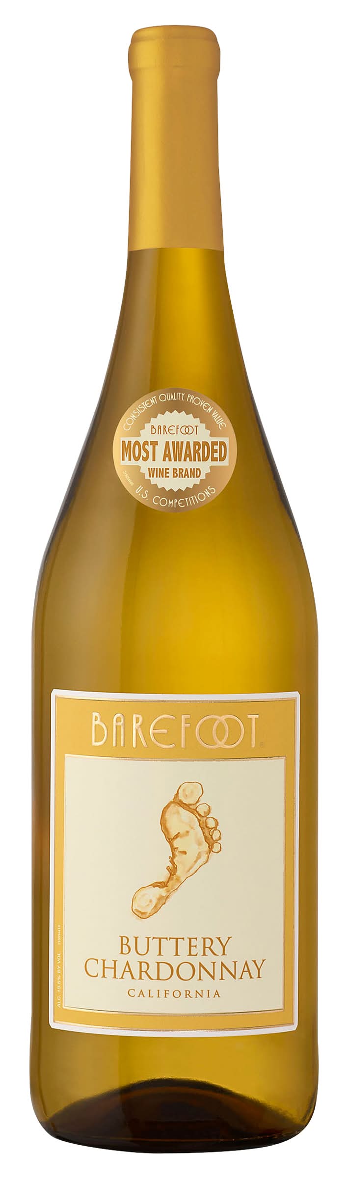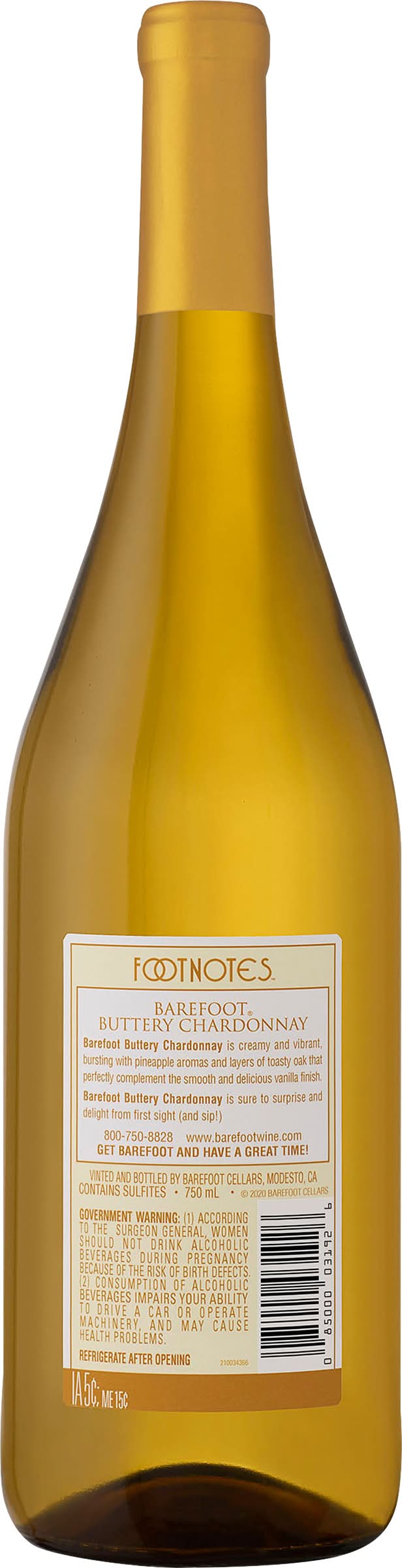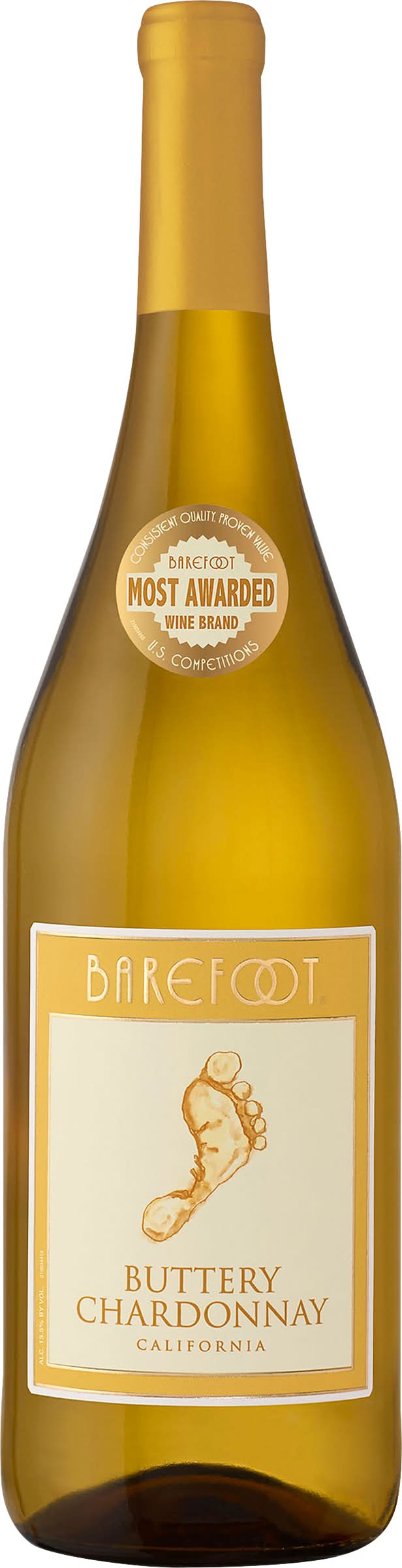 Footnotes: Barefoot Buttery Chardonnay is creamy and vibrant, bursting with pineapple aromas and layers of toasty oak that perfectly complement the smooth and delicious vanilla finish. Barefoot Buttery Chardonnay is sure to surprise and delight from first sight (and sip!). Get barefoot and have a great time! www.barefootwine.com. 800-750-8828. Barefoot most awarded wine brand. Consistent quality. Proven value. U.S. competitions. Alc. 13.5% by vol. 27 Vinted and Bottled by Barefoot Cellars, Modesto, CA. Alcohol by volume: 13.5%
