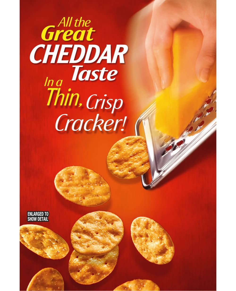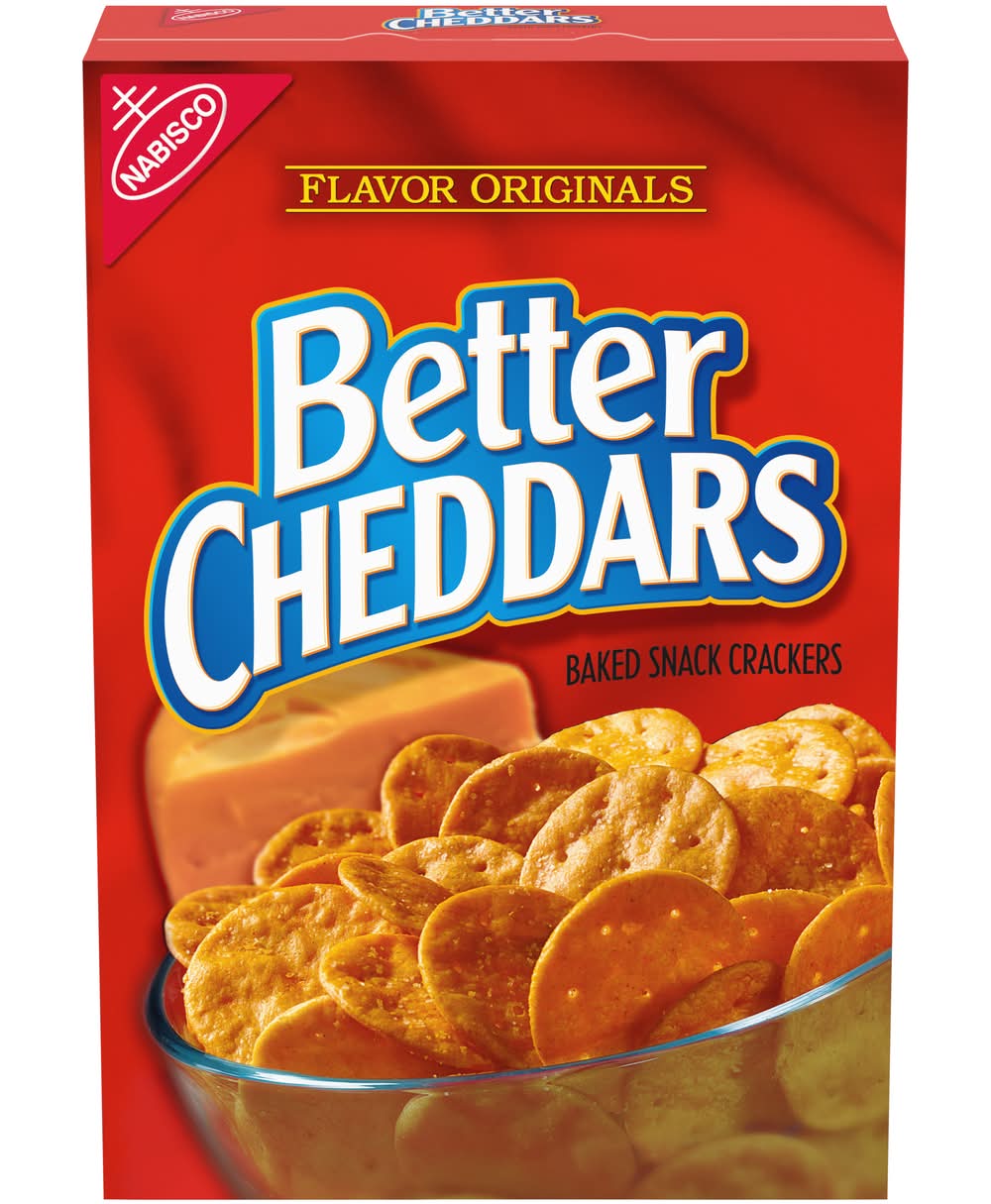 Flavor Originals Better Cheddars Cheddar Cheese Crackers are oven baked with a delightfully crispy, thin texture and an irresistible crunch. Pack these cheddar crackers in lunchboxes for a crunchy companion to sandwiches or add these cheese crackers to your snack food shelf as a tasty afternoon snack by themselves. Serve these cheese snacks alongside other crackers, cheese crackers, potato chips and snacks or by themselves for a delightfully crispy and cheesy snack that's great for munching without filling up. Includes one 6.5 oz box of Better Cheddars Baked Snack Crackers.