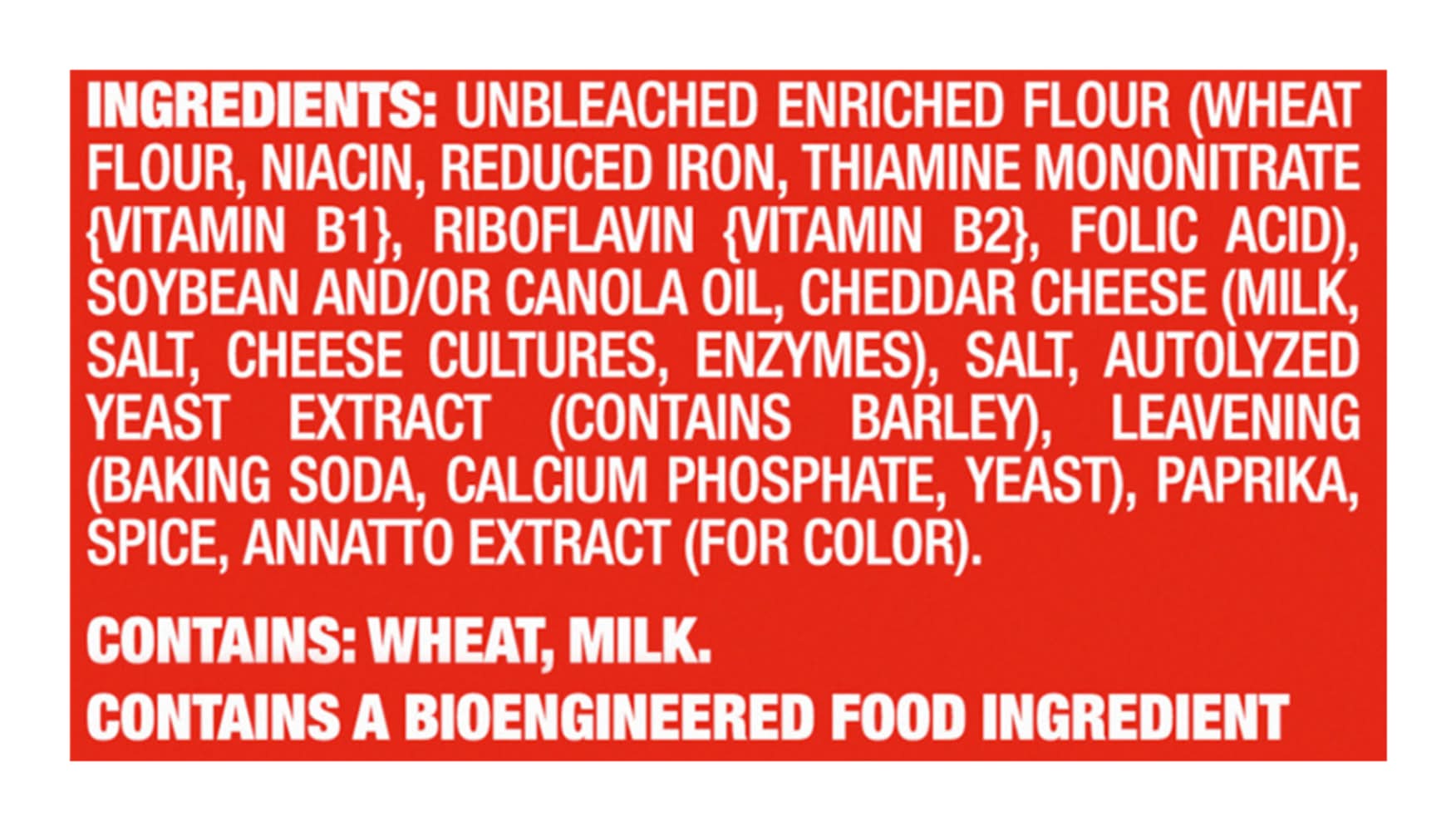 Ingredients: INGREDIENTS: UNBLEACHED ENRICHED FLOUR (WHEAT FLOUR, NIACIN, REDUCED IRON, THIAMINE MONONITRATE {VITAMIN B1}, RIBOFLAVIN {VITAMIN B2}, FOLIC ACID), SOYBEAN AND, OR CANOLA OIL, CHEDDAR CHEESE (MILK, SALT, CHEESE CULTURES, ENZYMES), SALT, AUTOLYZED YEAST EXTRACT (CONTAINS BARLEY), LEAVENING (BAKING SODA, CALCIUM PHOSPHATE, YEAST), PAPRIKA, SPICE, ANNATTO EXTRACT (FOR COLOR), . CONTAINS: WHEAT, MILK. Contains: CONTAINS: WHEAT, MILK.