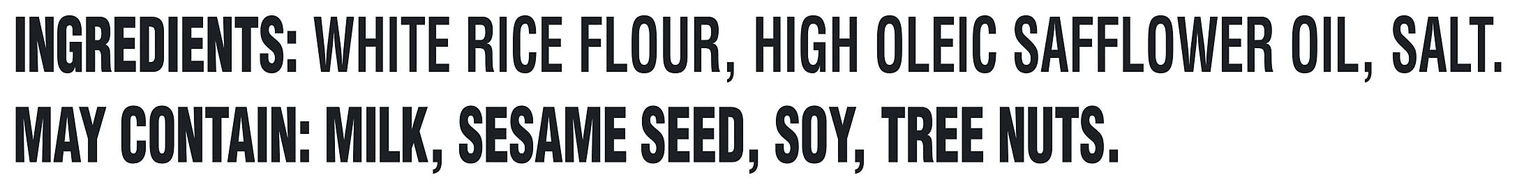 Ingredients: INGREDIENTS: WHITE RICE FLOUR, HIGH OLEIC SAFFLOWER OIL, SALT. MAY CONTAIN: MILK, SESAME SEED, SOY, TREE NUTS. Contains: MAY CONTAIN: MILK, SESAME SEED, SOY, TREE NUTS.