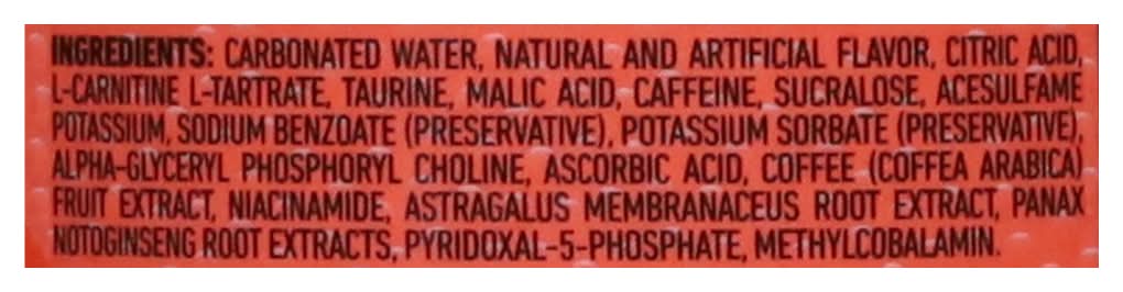 Ingredients: Carbonated Water, Natural and Artificial Flavor, Citric Acid, L-Carnitine L-Tartrate, Taurine, Malic Acid, Caffeine, Sucralose, Acesulfame Potassium, Sodium Benzoate (Preservative), Potassium Sorbate (Preservative), Alpha-Glyceryl Phosphoryl Choline, Ascorbic Acid, Coffee (Coffea Arabica) Fruit Extract, Niacinamide, Astragalus Membranaceus Root Extract, Panax Notoginseng Root Extracts, Pyridoxal-5-Phosphate, Methylcobalamin