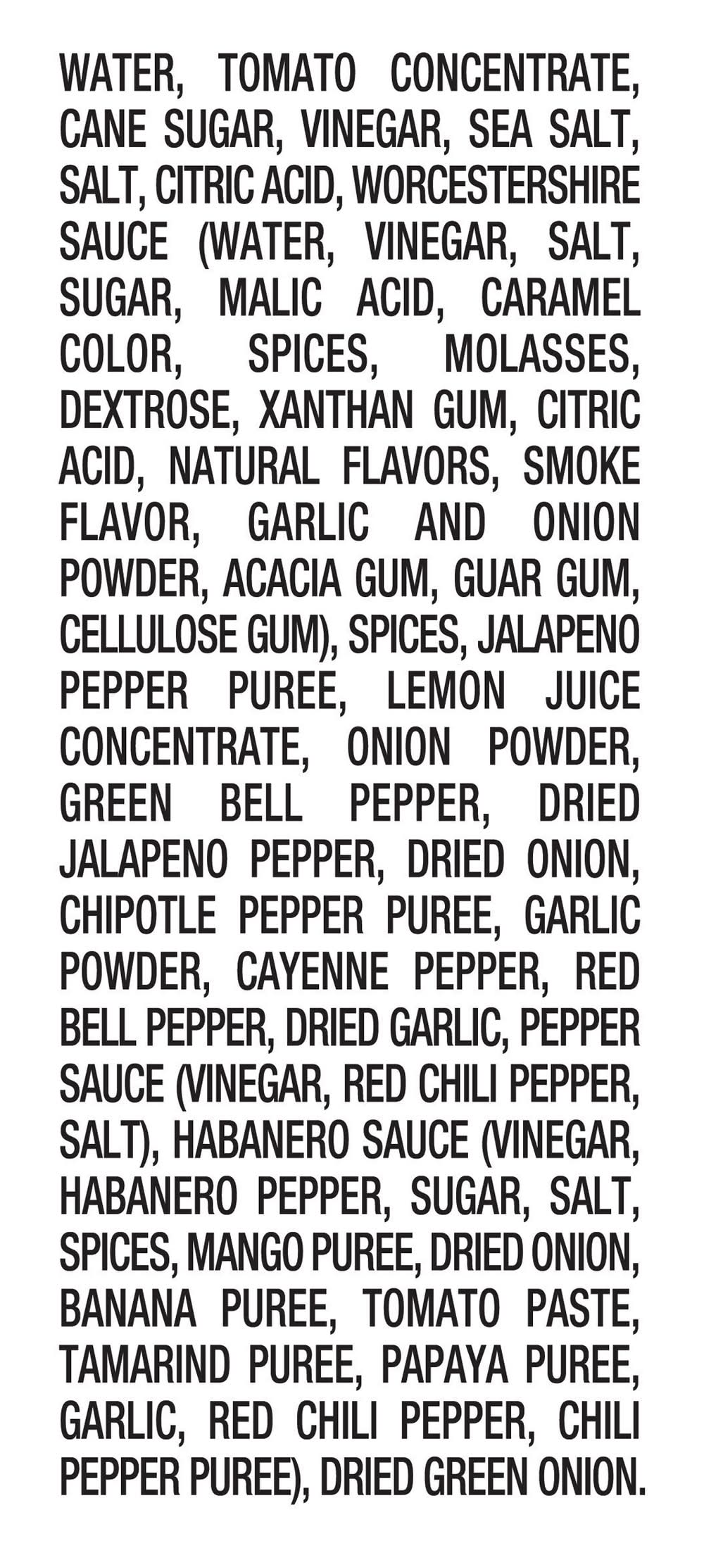 Ingredients: Water, Tomato Concentrate, Cane Sugar, Vinegar, Sea Salt, Salt, Citric Acid, Worcestershire Sauce (Water, Vinegar, Salt, Sugar, Malic Acid, Caramel Color, Spices, Molasses, Dextrose, Xanthan Gum, Citric Acid, Natural Flavors, Smoke Flavor, Garlic and Onion Powder, Acacia Gum, Guar Gum, Cellulose Gum), Spices, Jalapeno Pepper Puree, Lemon Juice Concentrate, Onion Powder, Green Bell Pepper, Dried Jalapeno Pepper, Dried Onion, Chipotle Pepper Puree, Garlic Powder, Cayenne Pepper, Red Bell Pepper, Dried Garlic, Pepper Sauce (Vinegar, Red Chili Pepper, Salt), Habanero Sauce (Vinegar, Habanero Pepper, Sugar, Salt, Spices, Mango Puree, Dried Onion, Banana Puree, Tomato Paste, Tamarind Puree, Papaya Puree, Garlic, Red Chili Pepper, Chili Pepper Puree), Dried Green Onion