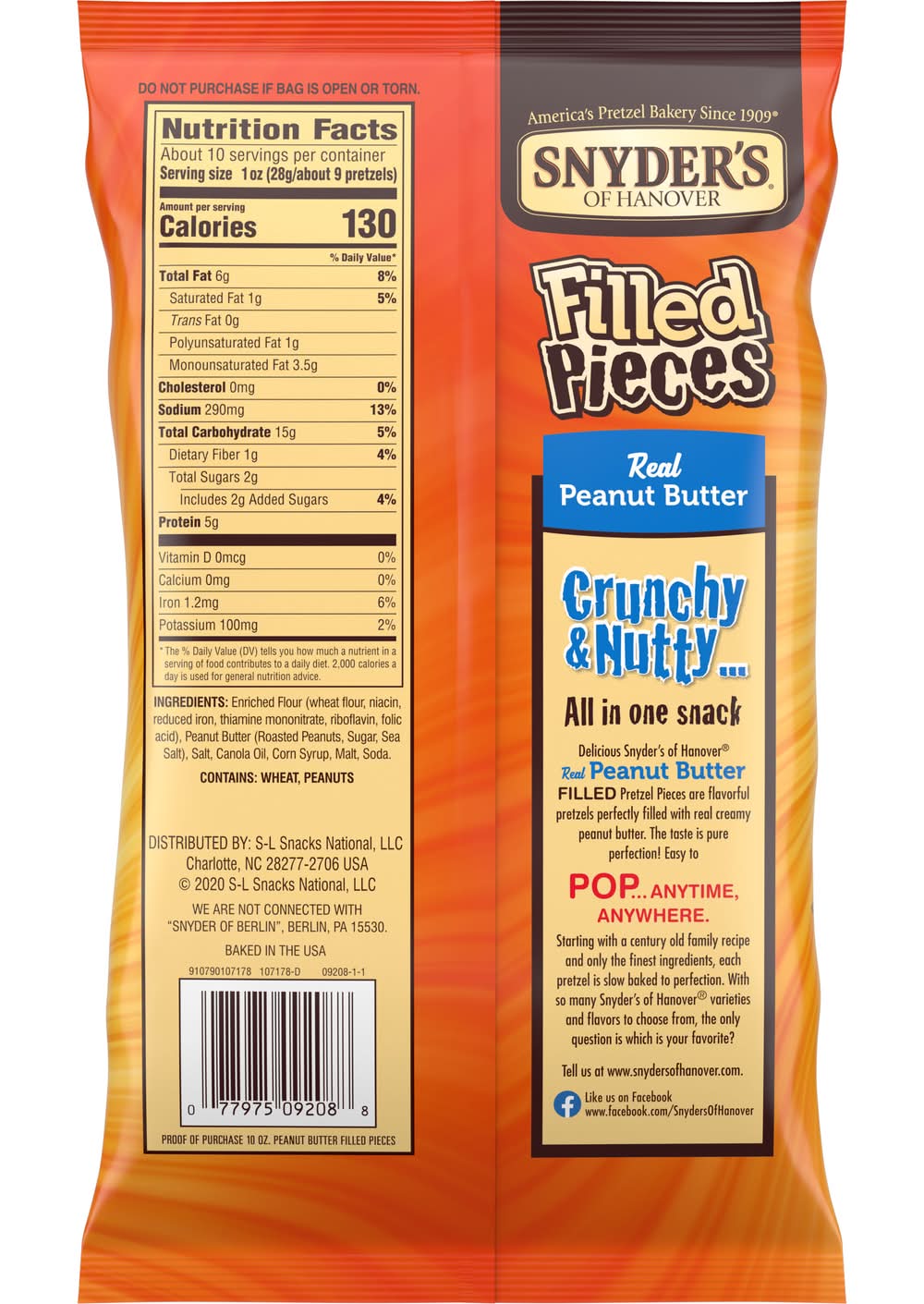 Delicious Snyder's of Hanover real Peanut Butter filled pretzel pieces are flavorful pretzels perfectly filled with real creamy peanut butter. The taste is pure perfection! They are bursting with intense flavor and delicious crunch for the perfect snack. And they're a baked alternative to potato chips with 0g trans fat, no MSG, and 5 grams of protein. You'll love these crunchy pretzel pieces as a lunch snack or school snack. Snyder's of Hanover has been America's Pretzel Bakery since 1909 and our pretzels give you that delicious crunch for the perfect snack! They are made from wholesome ingredients, kneaded, and oven-baked to seal in all the flavor. Snyder's of Hanover pretzels have been shared across tables, across generations and across the country, making us America's favorite pretzel brand.