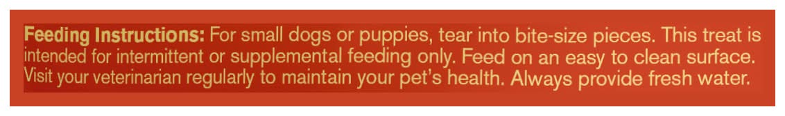 Directions for use: Directions: Keep refrigerated. Keep refrigerated & use within 10 days of opening. Freshest if sold by For small dogs or puppies, tear into bite-size pieces. This treat is intended for intermittent or supplemental feeding only. Feed on an easy to clean surface. Visit your veterinarian regularly to maintain your pet's health. Always provide fresh water. Storage recommendation: Keep refrigerated. Keep refrigerated & use within 10 days of opening.