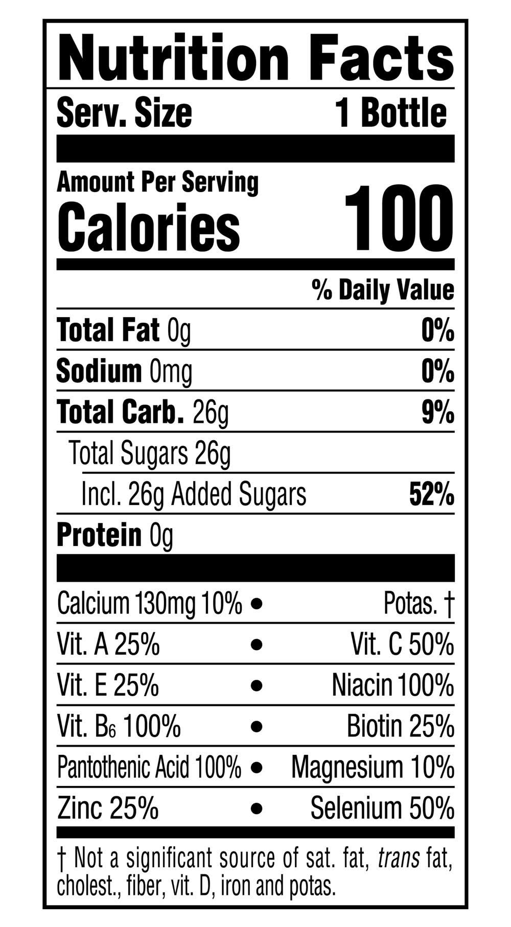 Ingredients: Reverse Osmosis Water, Crystalline Fructose, Less Than 0.5% Of: Electrolytes (Calcium And Magnesium Lactate And Calcium And Potassium Phosphate), Fruit Juice (For Color), Natural Flavors, Citric Acid, Cane Sugar, Vitamins A, C, E, B3, B5, B6, B7 (Retinyl Palmitate, Ascorbic Acid, Alpha-Tocopheryl Acetate, Niacinamide, Calcium Pantothenate, Pyridoxine Hydrochloride, Biotin), Zinc Gluconate, Stevia Leaf Extract, Sodium Selenate (Selenium).