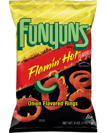 Enjoy a bold snack with Funyuns Onion Rings, featuring a flamin' hot flavor for a spicy twist on the classic onion ring shape. Each bite delivers a crispy texture and a sizzling taste sensation. Ideal for those seeking a savory treat with an extra kick. • Flavor: Onion • Frito-Lay, Inc., Plano,TX.