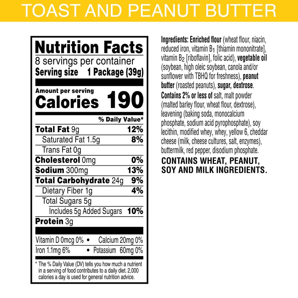 Keebler Toast and Peanut Butter sandwich crackers are the real deal. These conveniently packaged crackers feature a tempting combination of crunchy crackers sandwiched around a tasty filling made with real peanut butter. It's total snacking satisfaction! Made with no high fructose corn syrup, these crunchy, flaky sandwich crackers pack a huge punch of flavor that's irresistible for anytime snack cravings; Keebler Toast and Peanut Butter sandwich crackers are a great snack to pass out at game time, add to a party spread, pack in a school lunch, enjoy as an after school treat, grab for late-night munching, and more. The peanut-buttery options are endless. Toss a package of Keebler sandwich crackers in your tote to bring along on field trips, trips to the park, or even while you're running everyday errands. You'll love the one-of-a-kind flavor of real peanut butter in every tasty package of Keebler Toast and Peanut Butter sandwich crackers. • Flavor: Toast & peanut butter • Pack size: 8 • Kellogg sales co., Battle Creek,MI,49016