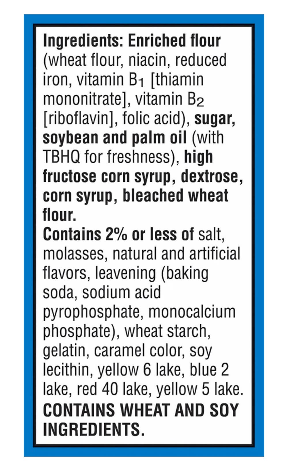 Ingredients: Enriched Flour (Wheat Flour, Niacin, Reduced Iron, Vitamin B1 [Thiamin Mononitrate], Vitamin B2 [Riboflavin], Folic Acid), Sugar, Soybean and Palm Oil (with TBHQ for Freshness), High Fructose Corn Syrup, Dextrose, Corn Syrup, Bleached Wheat Flour, Contains 2% or Less of Salt, Molasses, Natural and Artificial Flavors, Leavening (Baking Soda, Sodium Acid Pyrophosphate, Monocalcium Phosphate), Wheat Starch, Gelatin, Caramel Color, Soy Lecithin, Yellow 6 Lake, Blue 2 Lake, Red 40 Lake, Yellow 5 Lake Contains: Wheat, Soybeans, Corn