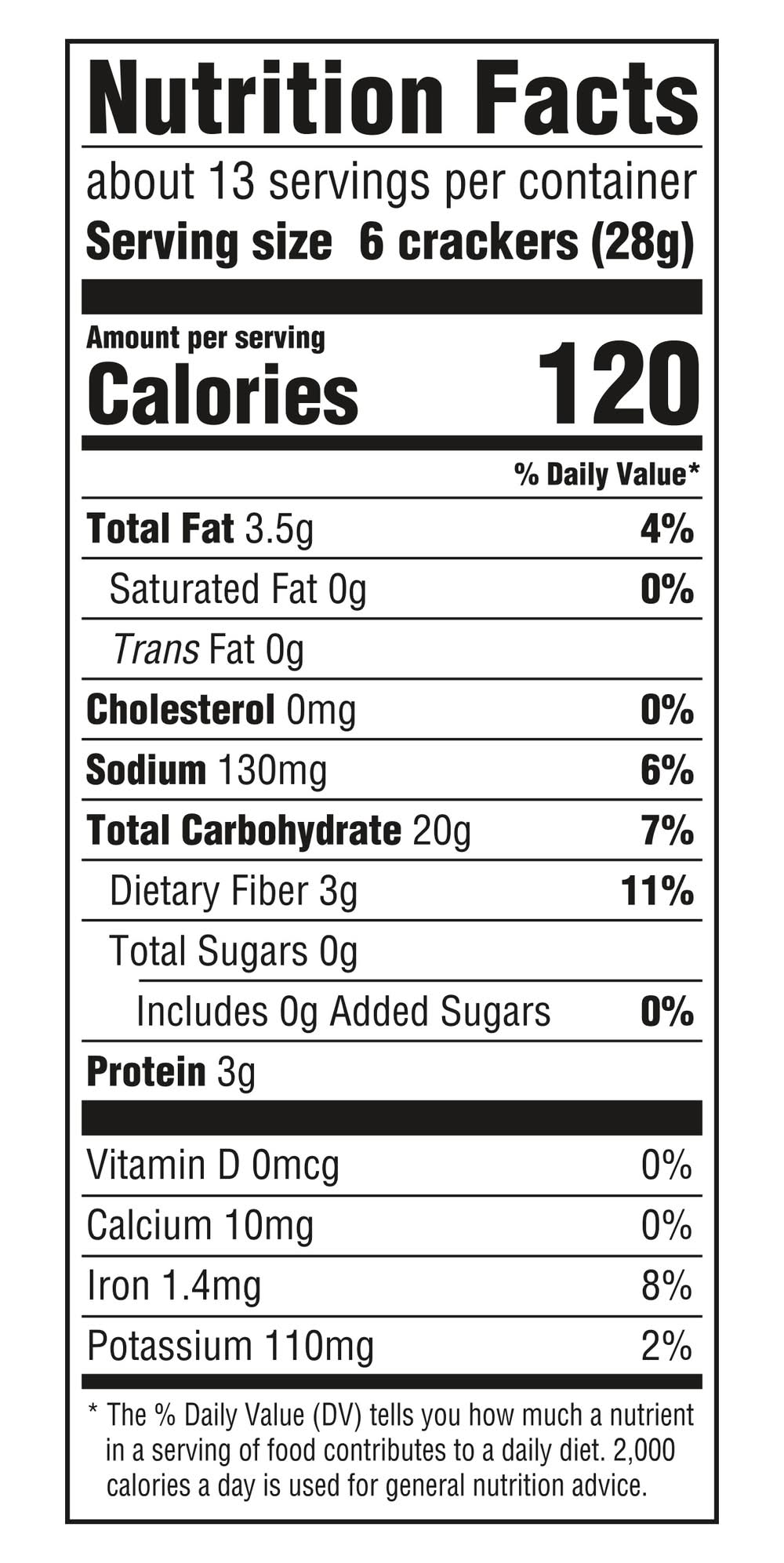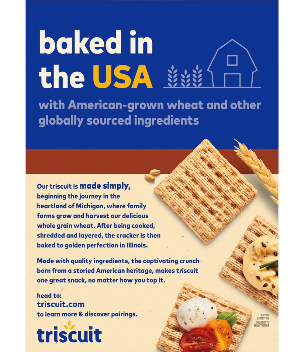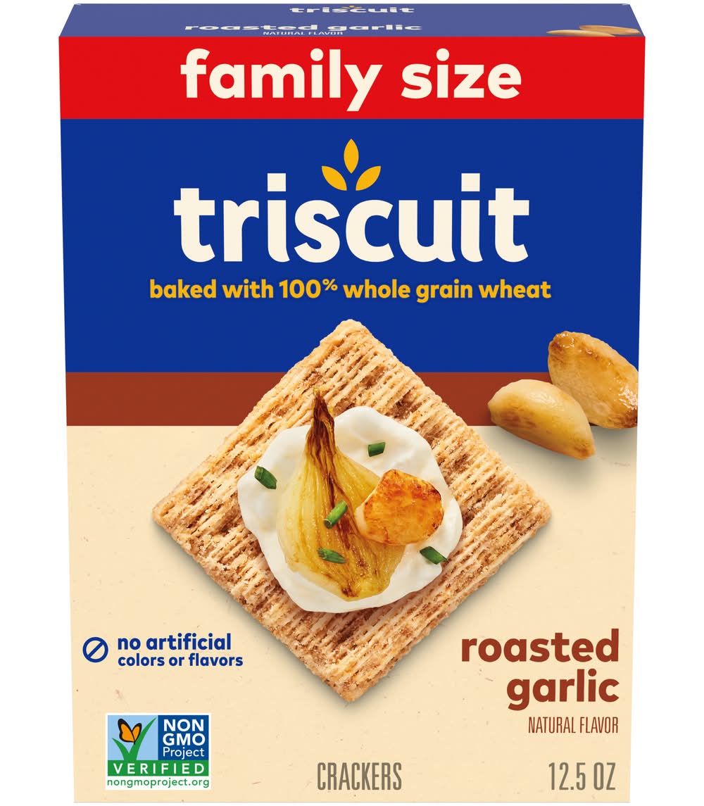 Triscuit Roasted Garlic Whole Grain Wheat Crackers are made simply with quality ingredients. Baked to perfection, these snack crackers use 100% whole grain wheat proudly grown in the USA and sunflower oil. The square snack crackers are made with their signature woven texture for a satisfying crunch. Roasted Garlic Triscuit crackers are Non-GMO Project Verified, made without artificial colors or flavors and a good source of dietary fiber (see nutritional information for fat content) for delicious wholesome goodness. Enjoy the crunch of these delicious crackers on their own, or top with your favorite cheese, fruit, or flavorful spreads. Triscuit cracker snacks cover all of your snacking needs, whether you need lunch snacks for kids, snacks for adults or on the go snacks for traveling. Serve them at parties by creating a delicious charcuterie board featuring Triscuit crackers alongside your favorite cheese, meat, fruit, and vegetables for an easy appetizer. • Mondelez Global LLC, East Hanover, NJ, 07936, USA • Packaging: Reusable