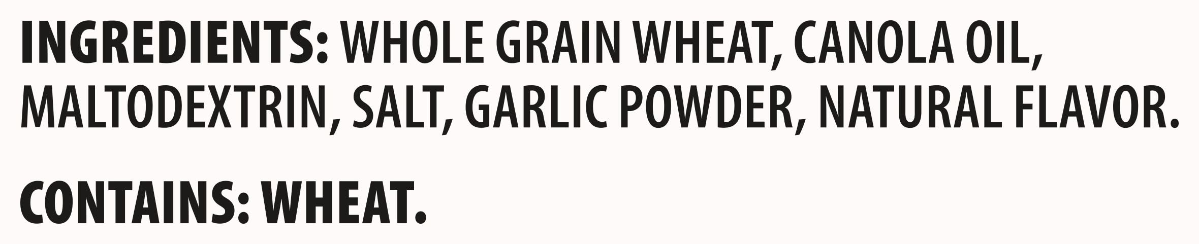 Ingredients: INGREDIENTS: WHOLE GRAIN WHEAT, CANOLA OIL, MALTODEXTRIN, SALT, GARLIC POWDER, NATURAL FLAVOR. CONTAINS: WHEAT. Contains: CONTAINS: WHEAT.