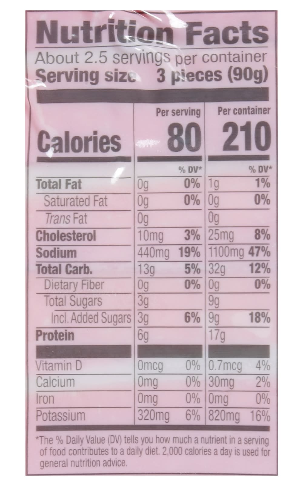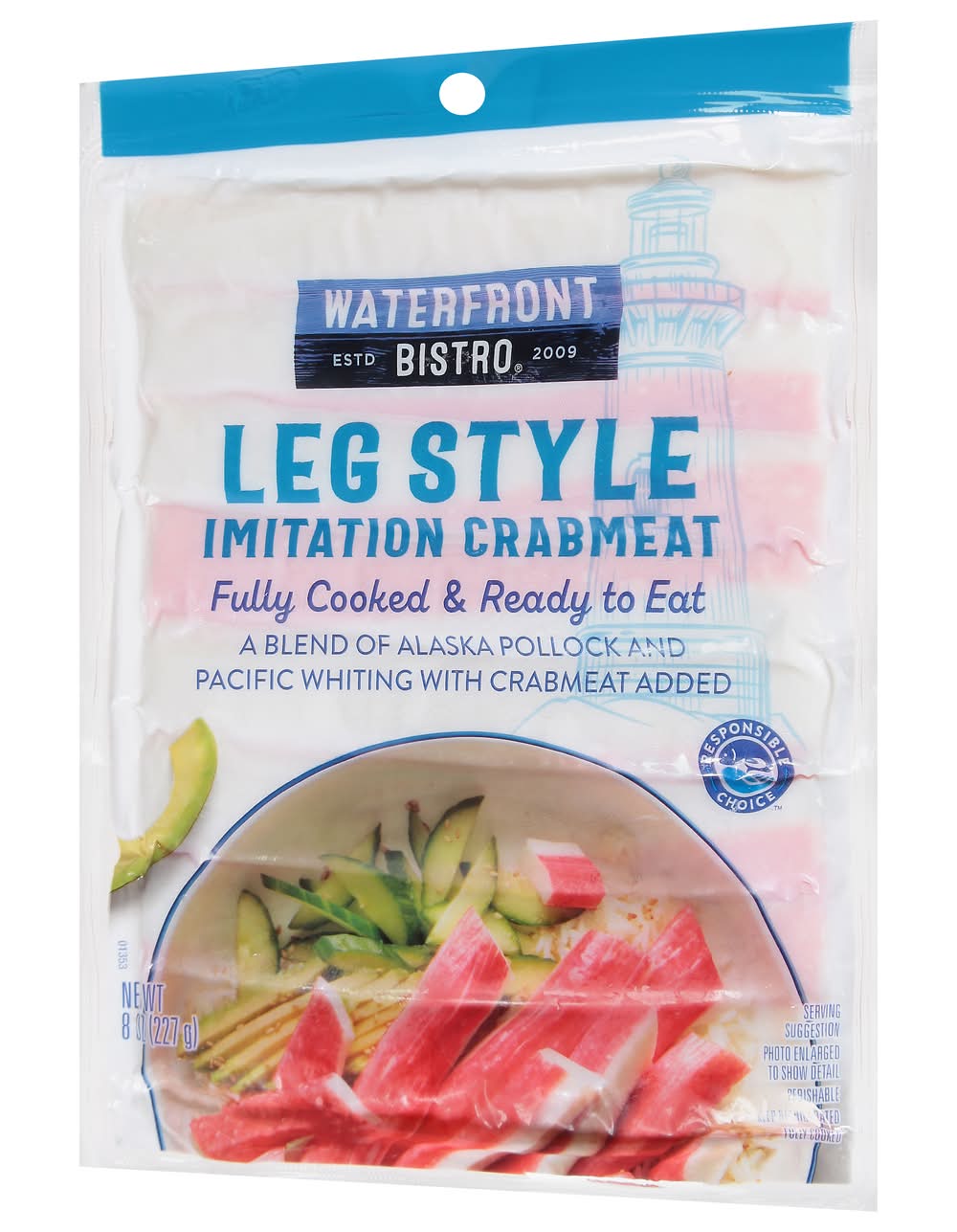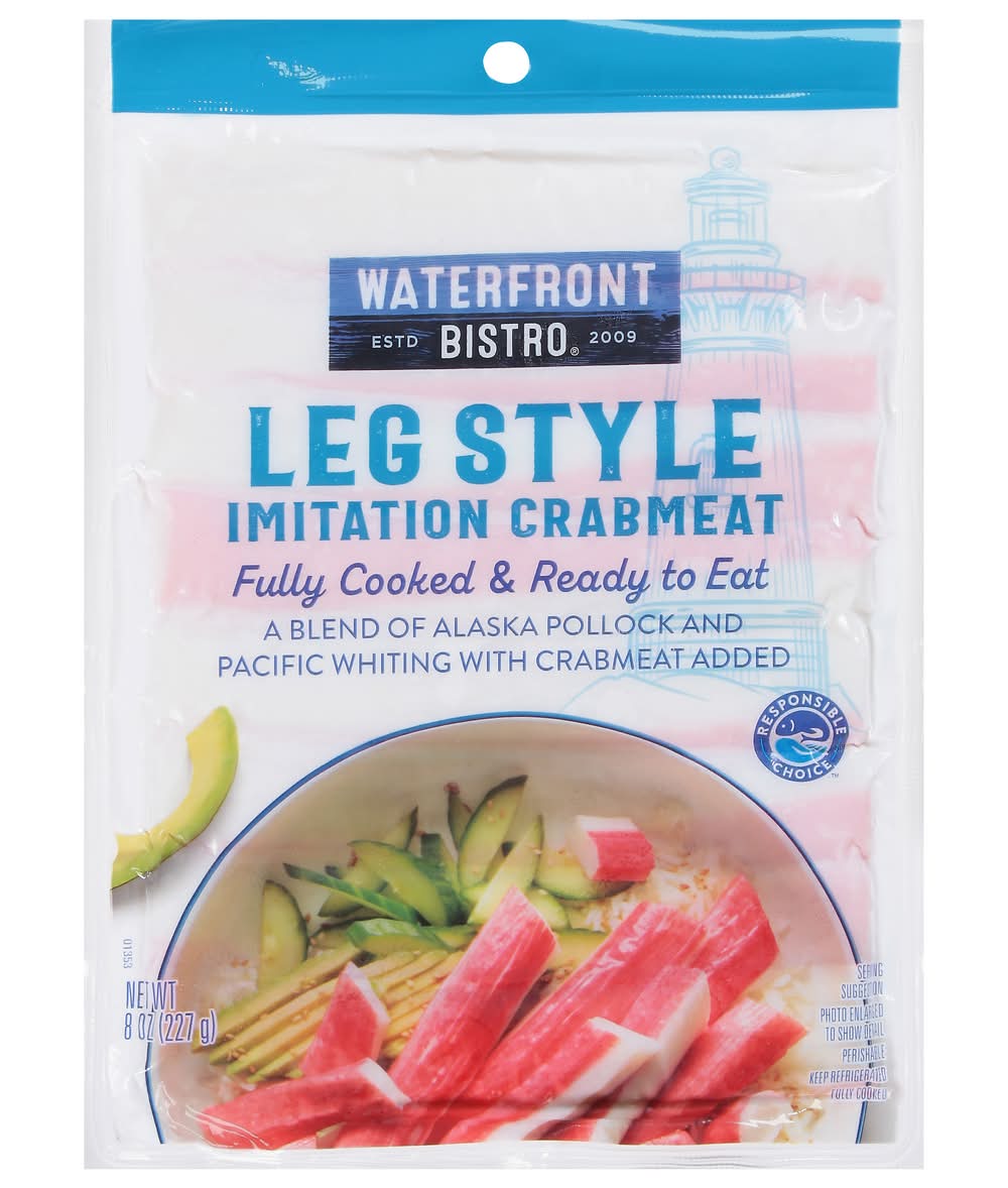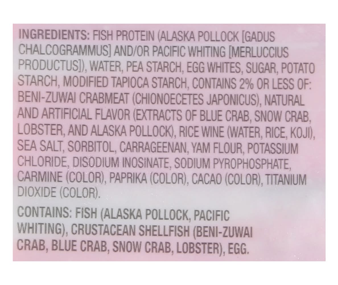 Ingredients: Fish Protein (Alaska Pollock [Gadus Chalcogrammus] and/or Pacific Whiting [Merluccius Productus]), Water, Pea Starch, Egg Whites, Sugar, Potato Starch, Modified Tapioca Starch, Contains 2% or Less of: Beni-Zuwai Crabmeat (Chionocetes Japonicus), Natural and Artificial Flavor (Extracts of Blue Crab, Snow Crab, Lobster, and Alaska Pollock), Rice Wine (Water, Rice, Koji), Sea Salt, Sorbitol, Carrageenan, Yam Flour, Potassium Chloride, Disodium Inosinate, Sodium Pyrophosphate, Carmine (Color), Paprika (Color), Cacao (Color), Titanium Dioxide (Color) Contains: Fish, Pollock, Fish, Whiting, Crustacean Shellfish, Crab, Crustacean Shellfish, Lobster, Eggs