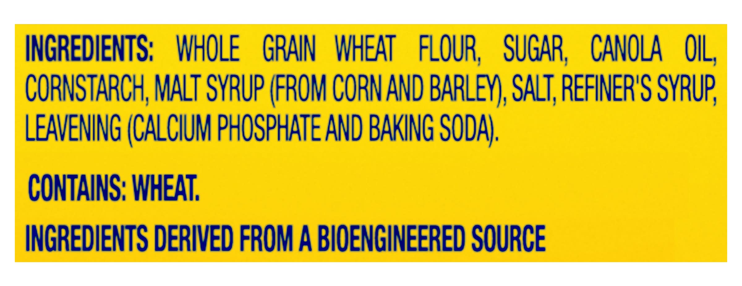 Ingredients: Whole Grain Wheat Flour, Sugar, Canola Oil, Cornstarch, Malt Syrup (from Corn and Barley), Salt, Refiner's Syrup, Leavening (Calcium Phosphate and Baking Soda) Contains: Wheat, Barley