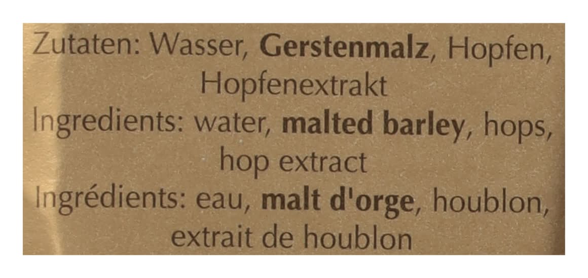 Ingredients: Water, Malted Barley, Hops, Hop Extract