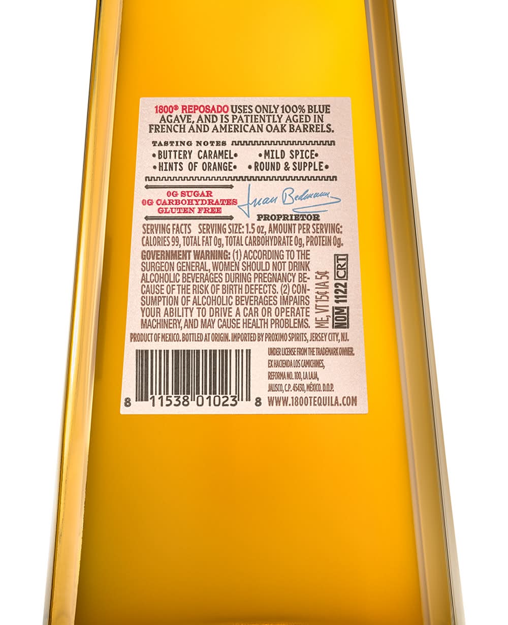 1800 Reposado tequila is crafted using 100% Tequilana Weber blue agave cared for and handpicked by expert farmers in the highlands of Jalisco, Mexico. A selection of double-distilled white tequilas are blended together then matured in French and American oak barrels. This rich liquid has notes of buttery caramel, mild spices and a touch of smokiness, which is imparted by the finishing process. Perfect mixed in a cocktail or on the rocks. • Alcohol by volume: 40% • Proximo, Jersey City, NJ