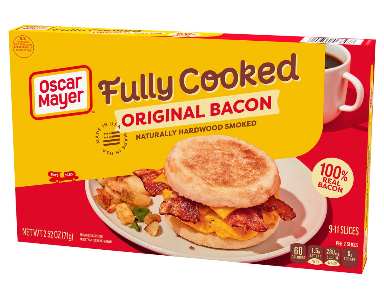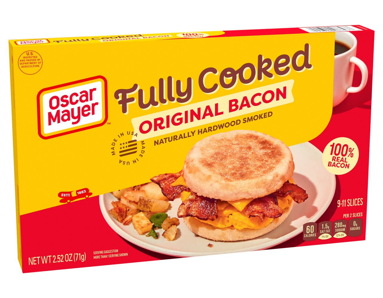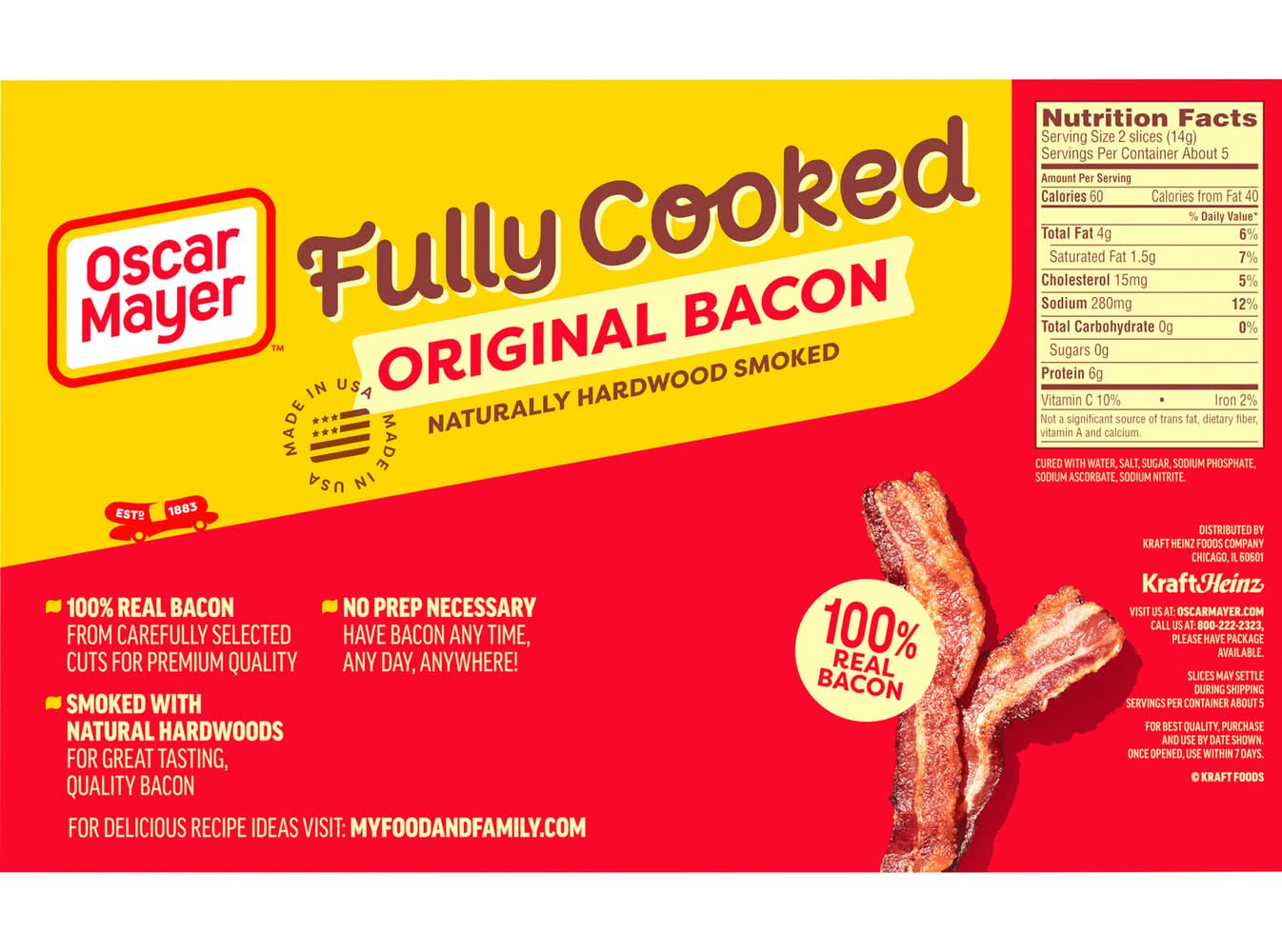 Everything is better with bacon. Oscar Mayer Fully Cooked Bacon Slices make it easy to add the delicious flavor of smoked bacon to any dish. Our precooked bacon is slow smoked with natural hardwoods to ensure our signature Oscar Mayer bacon flavor. Enjoy carefully selected cuts of 100% real bacon fully cooked to ensure premium quality. Try our sliced bacon on a breakfast sandwich, serve up bacon and eggs, or cut the slices up to sprinkle on your favorite salad and baked potatoes. You can enjoy our fully cooked bacon hot or cold without the hassle of cooking in a pan. Our 2.52-ounce box of smoked bacon with 9-11 slices comes in a resealable pouch to keep in your refrigerator for freshness. • Kraft Heinz Foods Company, Chicago,IL,60601 • Packaging: Reusable
