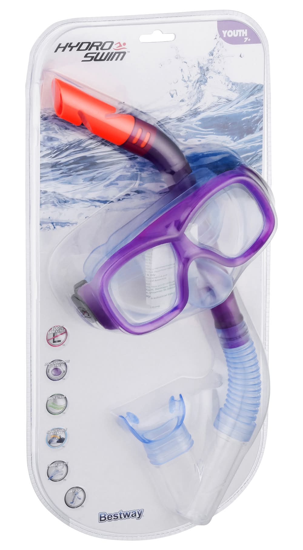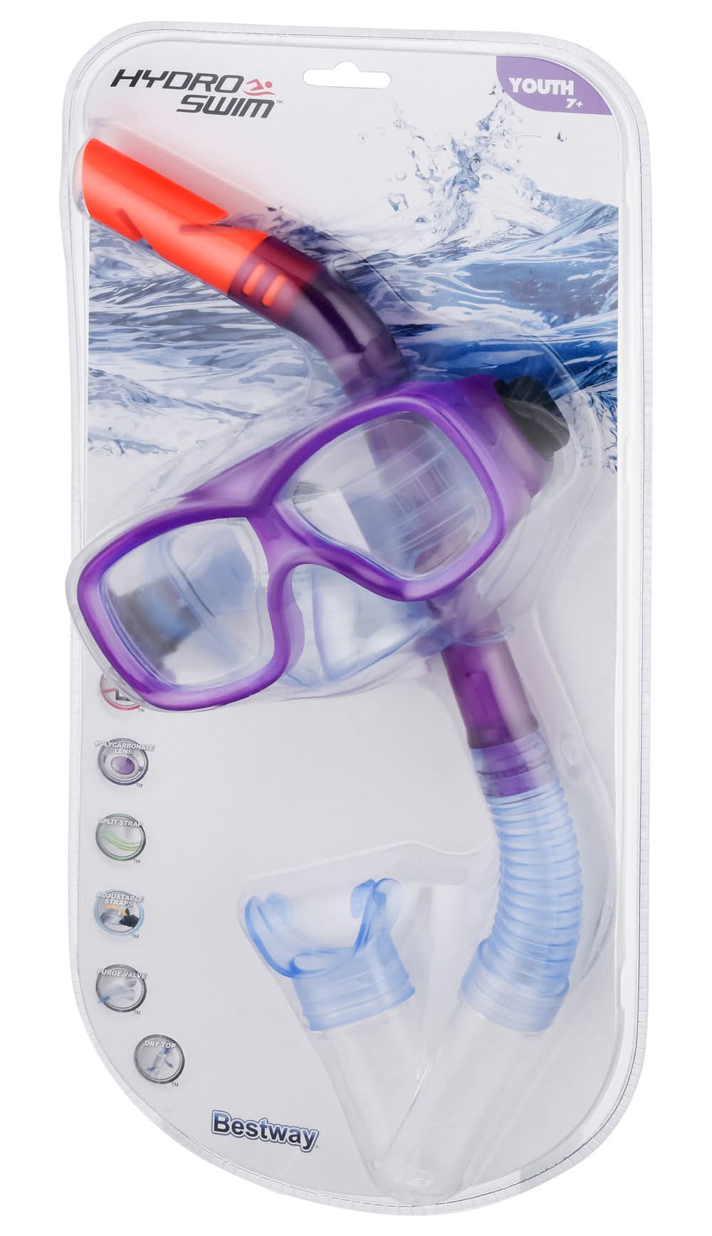 7+. Contents: One mask, one snorkel. 100% latex free. Polycarbonate lens. Split strap. Adjustable straps. Purge valve. Dry top. Pike Set: Aviator style polycarbonate lens with UV protective coating. Double feathered edge skirt for precision leak-resistant fit. Fully adjustable split head strap. Dry top snorkel technology prevents virtually all water infiltration. Soft comfort-fit snorkel mouthpiece. Integrated purge valve for easy water clearing. Adjustable snorkel strap retainer. Please retain for reference. CE listed. www.bestwaycorp.com. Made in China. Packaging: Reusable