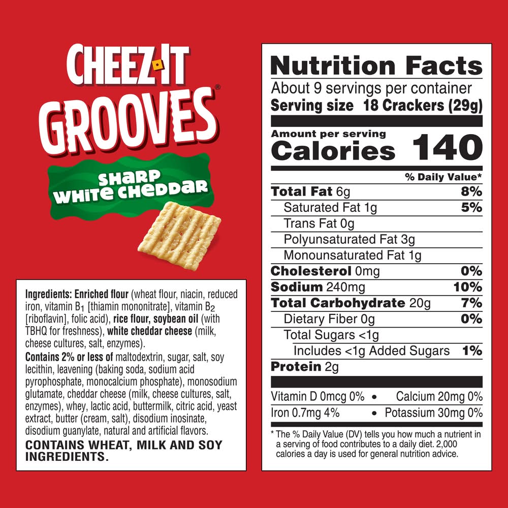 Discover the ridiculously craveable, bold flavor, and big crunch of Cheez-It Grooves Sharp White Cheddar crunchy cheese crackers. Each cracker delivers a bold kick of sharp white cheddar cheese and crunchy ridges for an enjoyable snack any time of day. Cheez-It Grooves are made with 100% real cheese aged for a one-of a kind taste. Perfect for a bite at the office, movie night, family get-togethers, or as a solo late-night white cheddar treat; The cheesy options are endless. Ideal for on the go, Cheez-It Grooves are great to enjoy in the car on a road trip or while running errands. They're also an epically cheesy addition to homemade snack mixes and party mixes. Whether you're looking for a crowd-favorite snack for a get together or packing school lunches, discover a cheesy, crunchy option everyone will love. Share them with friends and watch them be devoured by the handful. Irresistibly delicious, Cheez-It Grooves Sharp White Cheddar have so much flavor, it's a mind crunch. • Flavor: Sharp white cheddar • Kellogg Sales, Battle Creek,MI,49016
