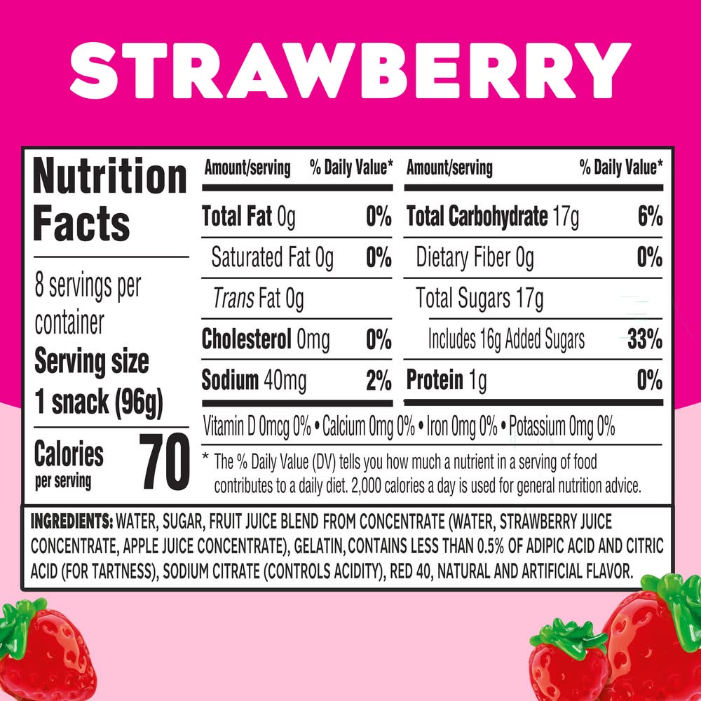 Ingredients: WATER, SUGAR, FRUIT JUICE BLEND FROM CONCENTRATE (WATER, STRAWBERRY JUICE CONCENTRATE, APPLE JUICE CONCENTRATE), GELATIN, CONTAINS LESS THAN 0.5% OF ADIPIC ACID AND CITRIC ACID (FOR TARTNESS), SODIUM CITRATE (CONTROLS ACIDITY), RED 40, NATURAL AND ARTIFICIAL FLAVOR.
