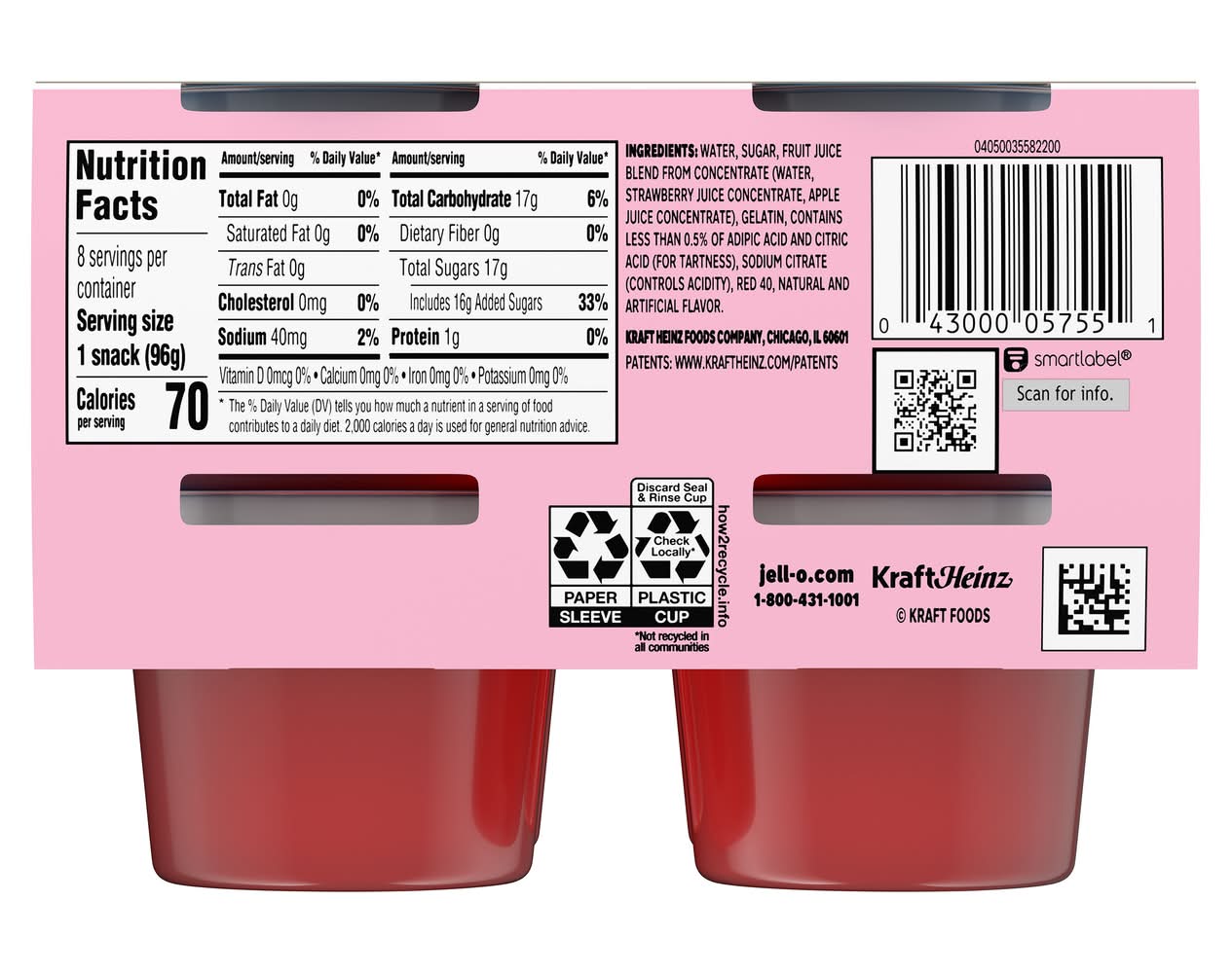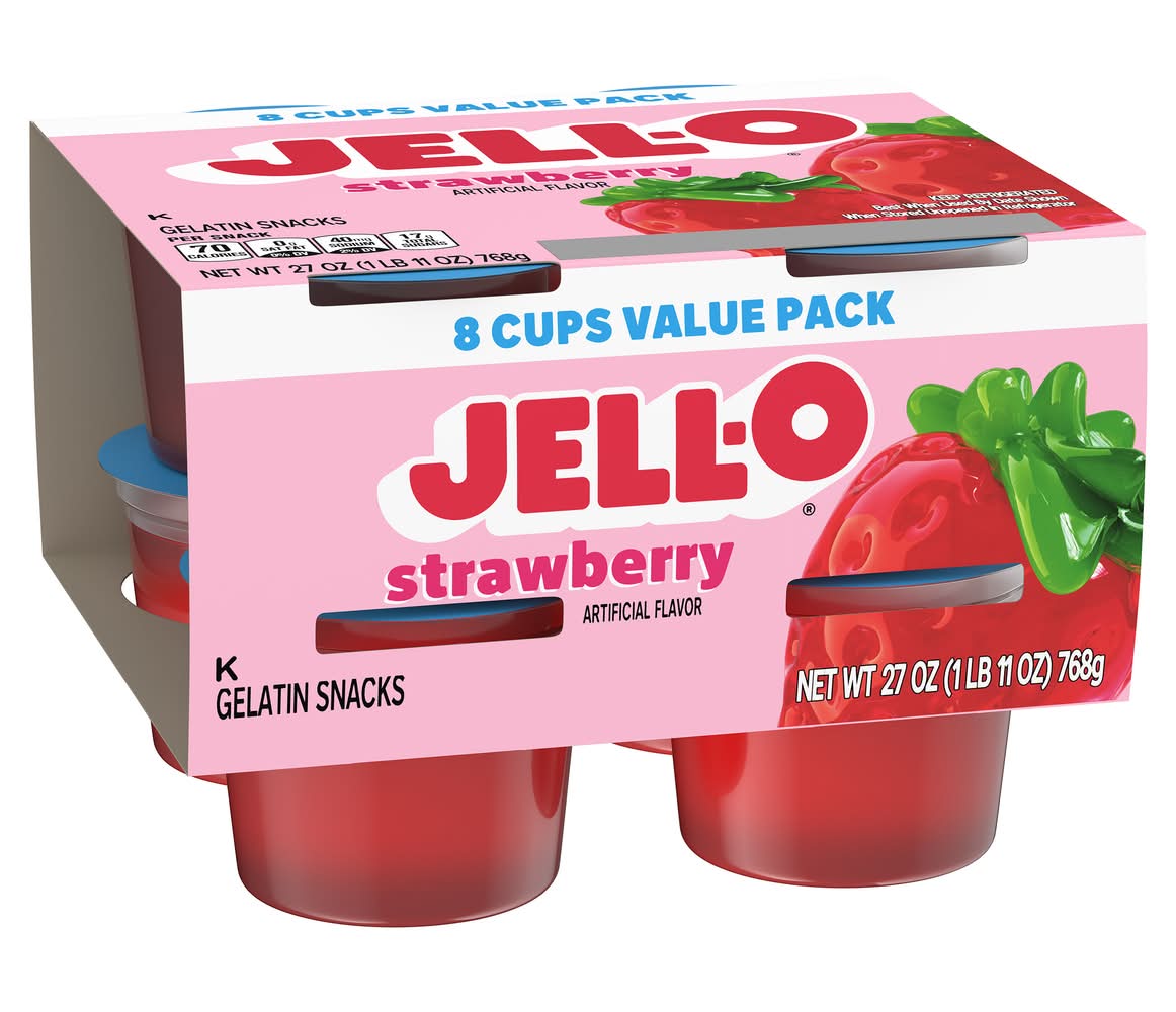 Snack happy. Jell-O Original Strawberry Artificially Flavored Ready-to-Eat Gelatin Snack Cups deliver the great taste of Jell-O Gelatin in an on-the-go cup. Our colorful, jiggly treat comes in individual snack cups, perfect for putting into a lunchbox, eating on the go or snacking at home. Add some wonder to your day with a delicious, convenient snack. Our refreshing gelatin treats your taste buds to juicy strawberry artificial flavor made with fruit juices and without high-fructose corn syrup. Each Jell-O cup contains 70 calories per serving. Each 27-ounce sleeve contains eight gelatin cups for quick and easy snacking. Spoon up a smile with Jell-O Original Strawberry Ready-to-Eat Gelatin Snack Cups.