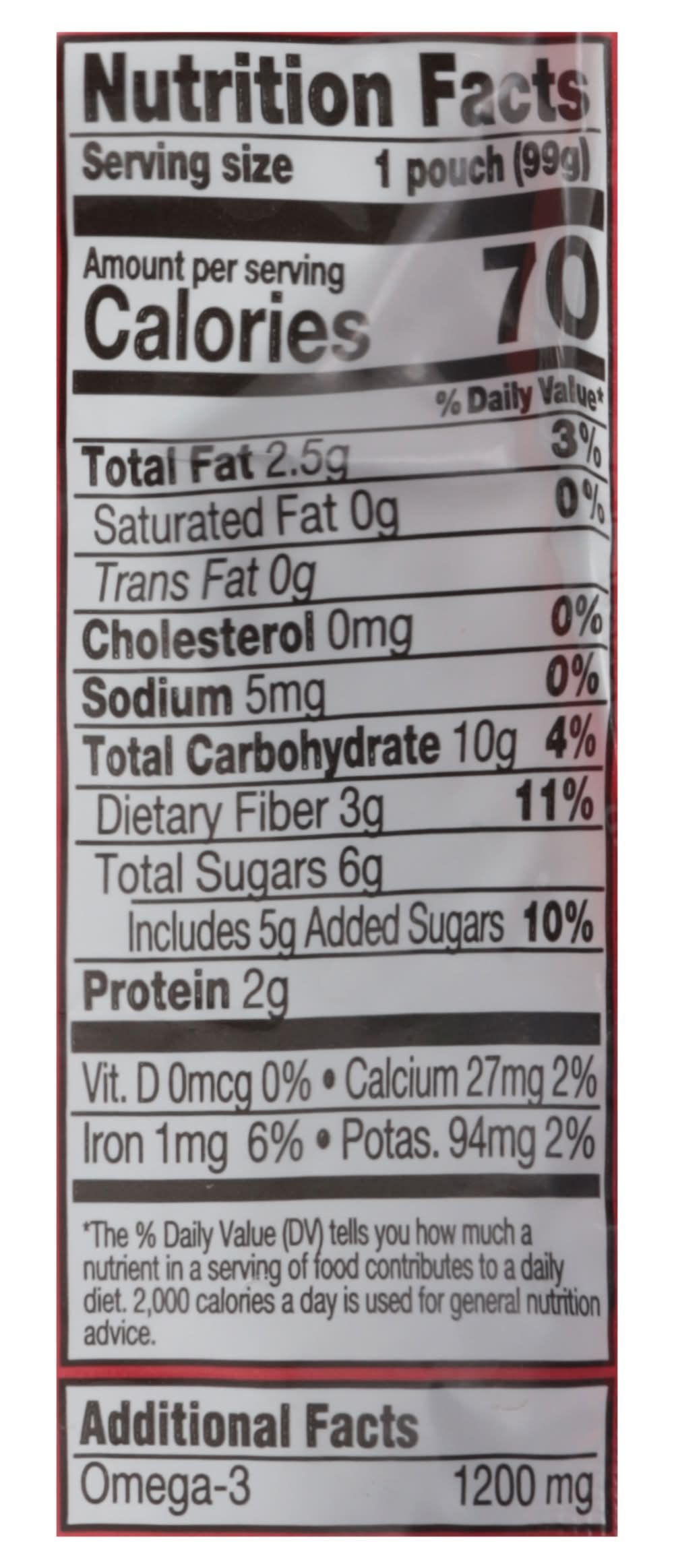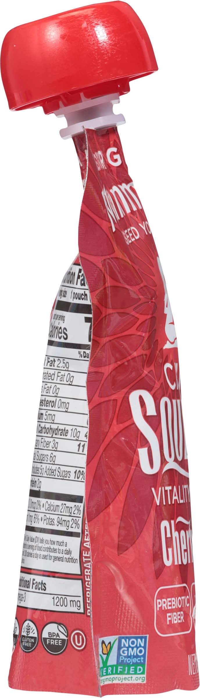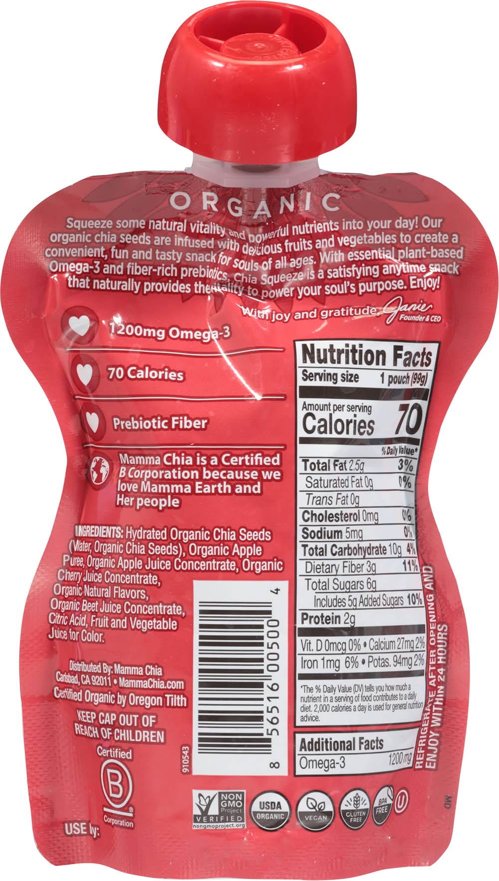 Ingredients: Hydrated Organic Chia Seeds (Water, Organic Chia Seeds), Organic Apple Puree, Organic Apple Juice Concentrate, Organic Cherry Juice Concentrate, Organic Natural Flavors, Organic Beet Juice Concentrate, Citric Acid, Fruit and Vegetable Juice for Color