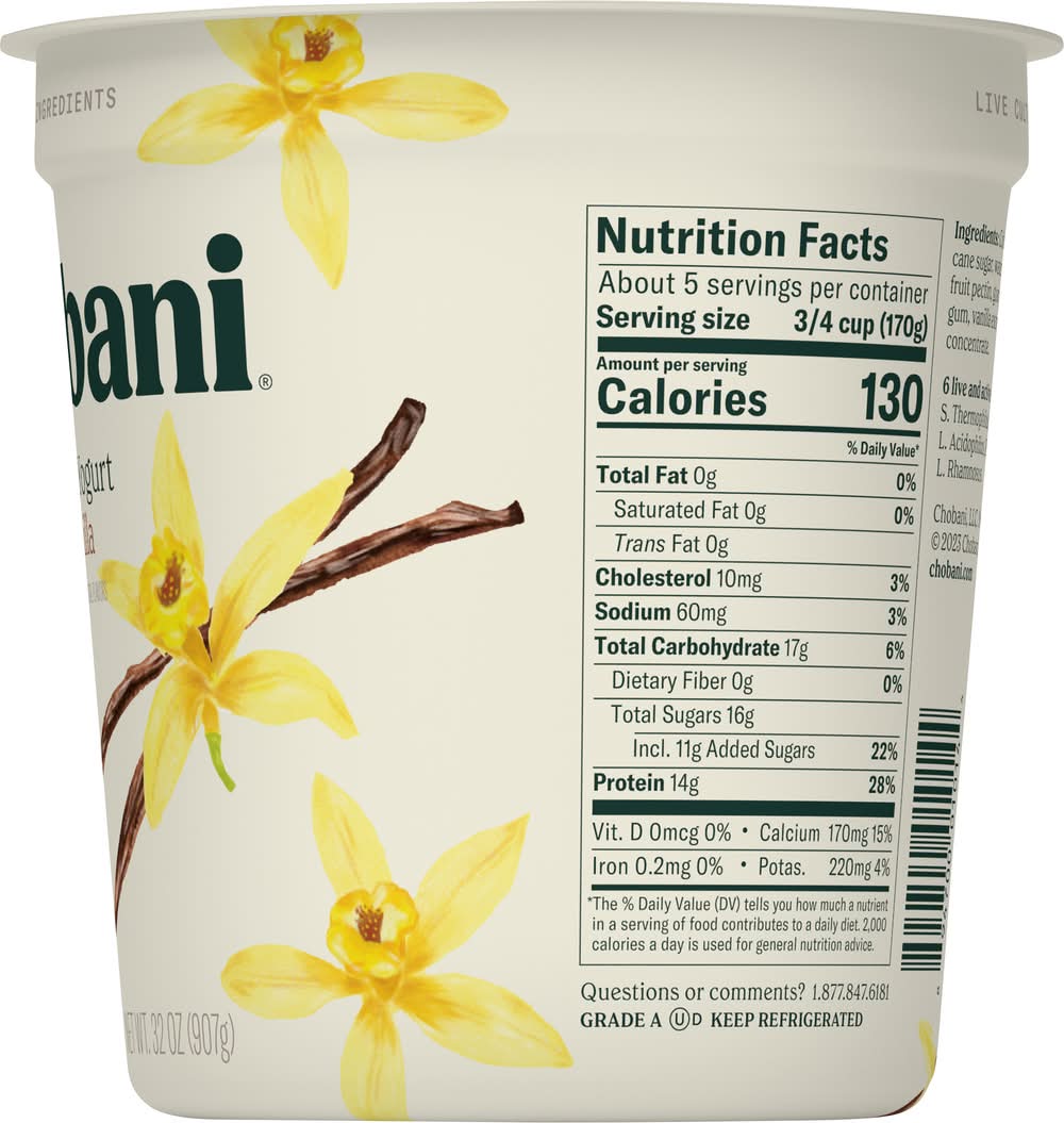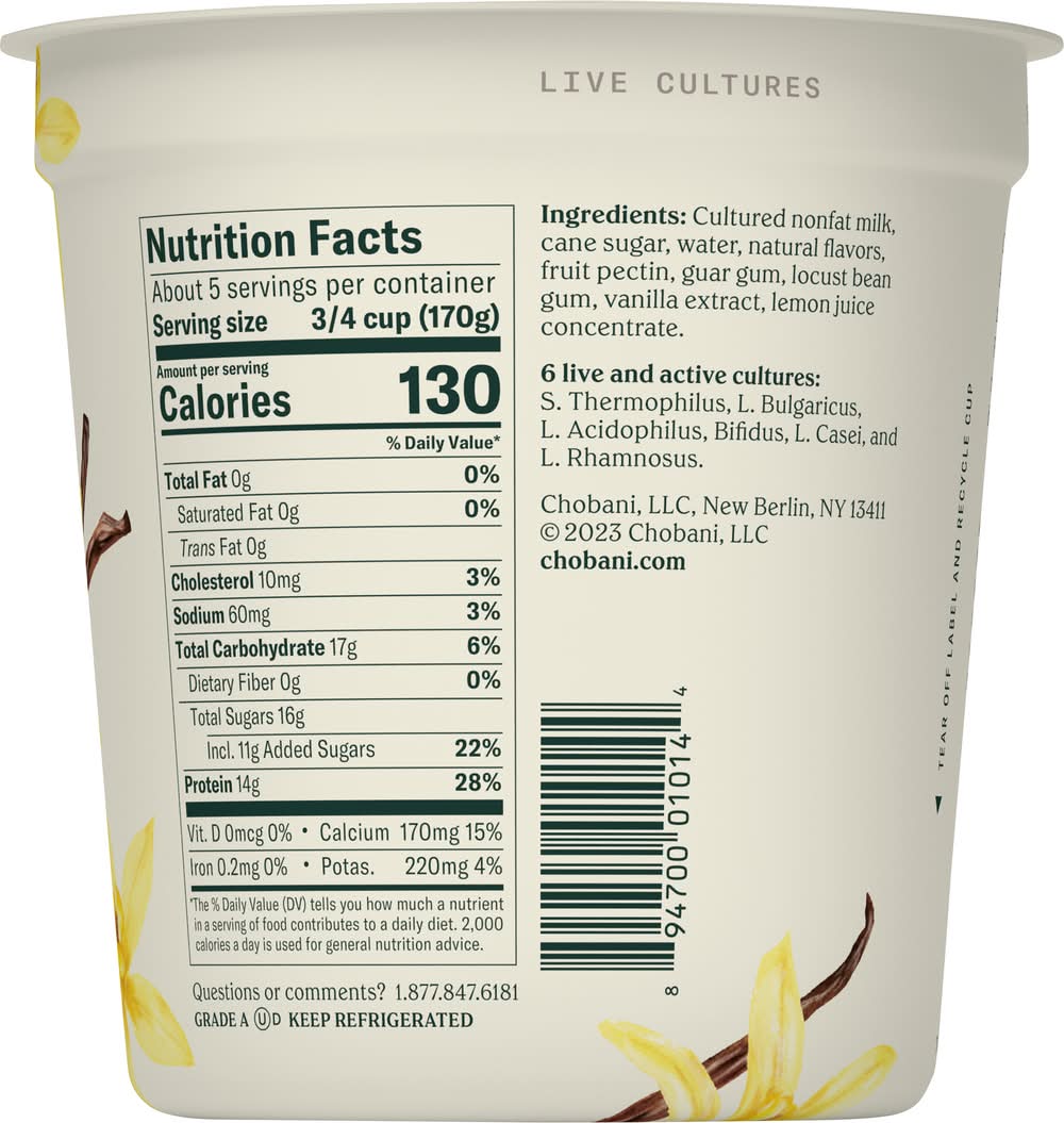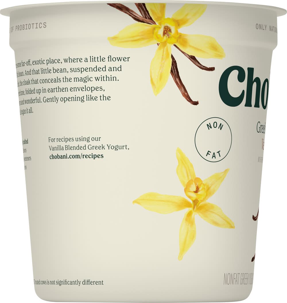 No artificial flavors. Non fat. No gluten. Carried from some far-off, exotic place, where a little flower became a little bean. And that little bean, suspended and unremarkable, the cloak that conceals the magic within. Flavor like perfume, folded up in earthen envelopes, rich and warm and wonderful. Gently opening like the blossom that began it all. Authentically Crafted, No artificial sweeteners, No preservatives. No rBST (Milk from rBST-treated cows is not significantly different). Tear off label and recycle cup. • Flavor: Vanilla • Chobani, llc, New Berlin, NY, 13411 • Packaging: Reusable