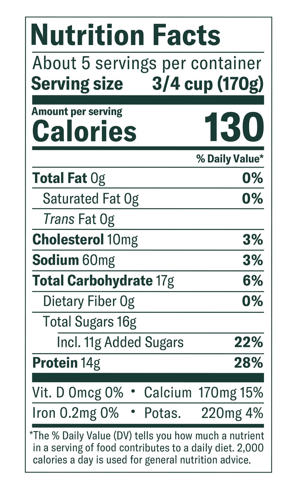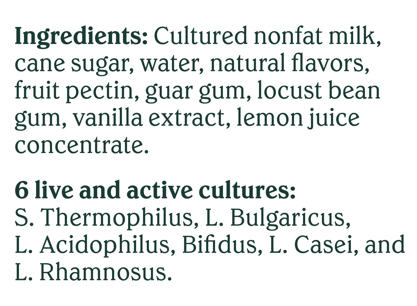 Ingredients: Cultured Nonfat Milk, Cane Sugar, Water, Natural Flavors, Fruit Pectin, Guar Gum, Locust Bean Gum, Vanilla Extract, Lemon Juice Concentrate. 6 Live and Active Cultures: S. Thermophilus, L. Bulgaricus, L. Acidophilus, Bifidus, L. Casei, and L. Rhamnosus Contains: Milk