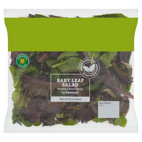 Our Baby Leaf Salad contains a mix of: Baby Red & Green Leaves: Tender & mild Baby Spinach: Mild & earthy Red Chard: Earthy with bitter notes • Sainsbury's Supermarkets Ltd, London, EC1N 2HT. • Packaging: Reusable