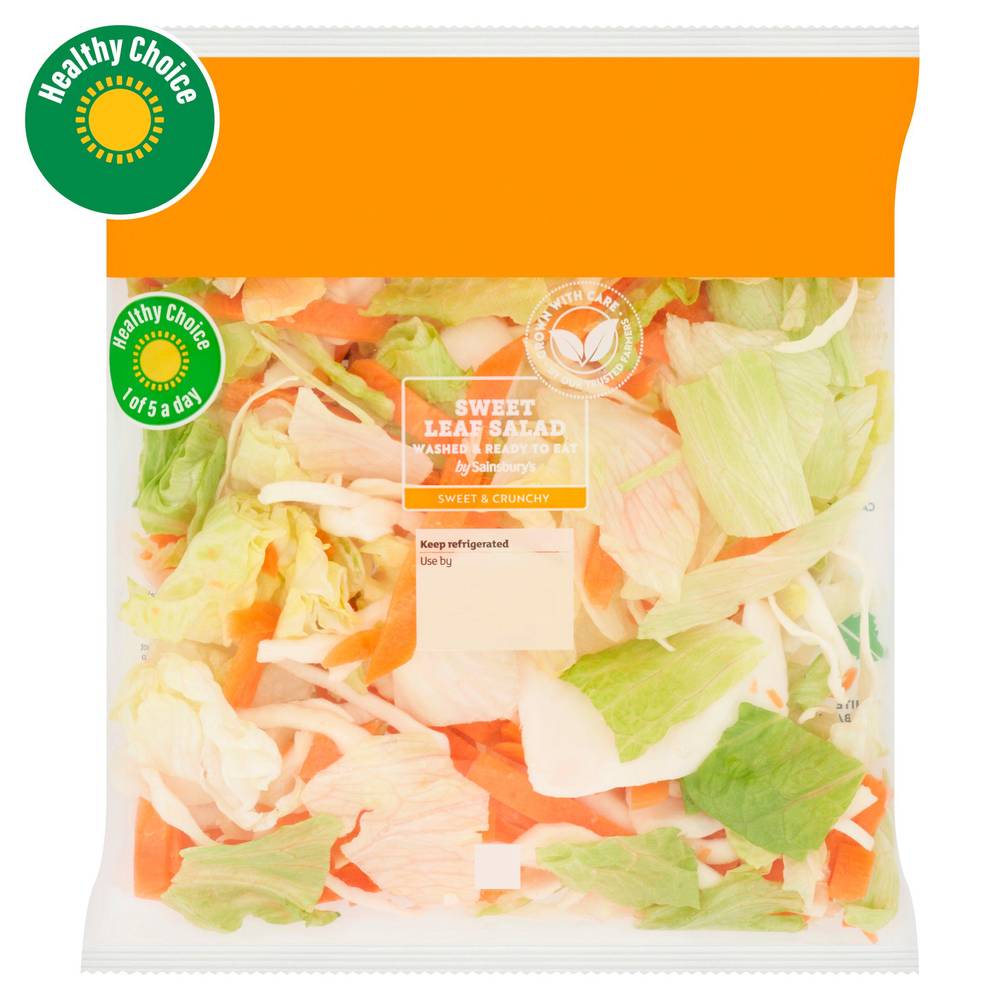 Salad is a combination of mixed salad leaves, carrot, and cabbage. It offers a sweet and crunchy taste profile and comes pre-washed, ready for consumption. Sainsbury's Supermarkets Ltd, London, EC1N 2HT.