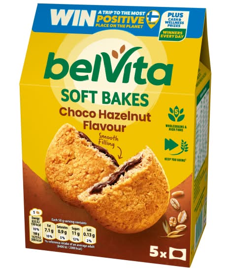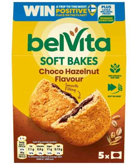 Soft baked biscuits made with wholegrain cereals with hazelnut flavor and a chocolate flavor filling and added minerals.Smooth filling Wholegrains & High Fibre Source of Calcium, Magnesium and Iron No Colors or Preservatives. • Flavor: Choco hazelnut • Mondelez UK, Freepost MDLZ, Mondelez UK, Uxbridge, UBS 1DH. • Packaging: Reusable