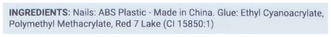 Ingredients: Nails: ABS PLASTIC- Made in China, Glue: Ethyl Cyanoacrylate, Polymethyl Methacrylate, Red 7 Lake (CI 15850:1)-Made in Korea