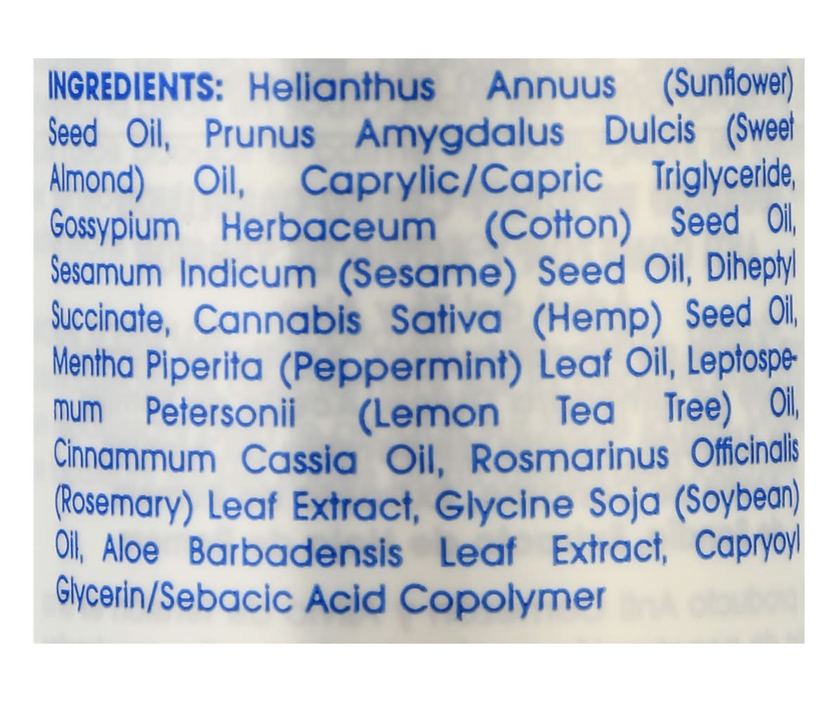 Ingredients: Helianthus Annuus (Sunflower) Seed Oil, Prunus Amygdalus Dulcis (Sweet Almond) Oil, Caprylic/Capric Triglyceride, Gossypium Herbaceum (Cotton) Seed Oil, Sesamum Indicum (Sesame) Seed Oil, Diheptyl Succinate, Cannabis Sativa (Hemp) Seed Oil, Mentha Piperita (Peppermint) Leaf Oil, Leptospermum Petersonii (Lemon Tea Tree) Oil, Cinnamomum Cassia Oil, Rosmarinus Officinalis (Rosemary) Leaf Extract, Glycine Soja (Soybean) Oil, Aloe Barbadensis Leaf Extract, Capryloyl Glycerin/Sebacic Acid Copolymer Contains: Tree Nuts, Soybeans