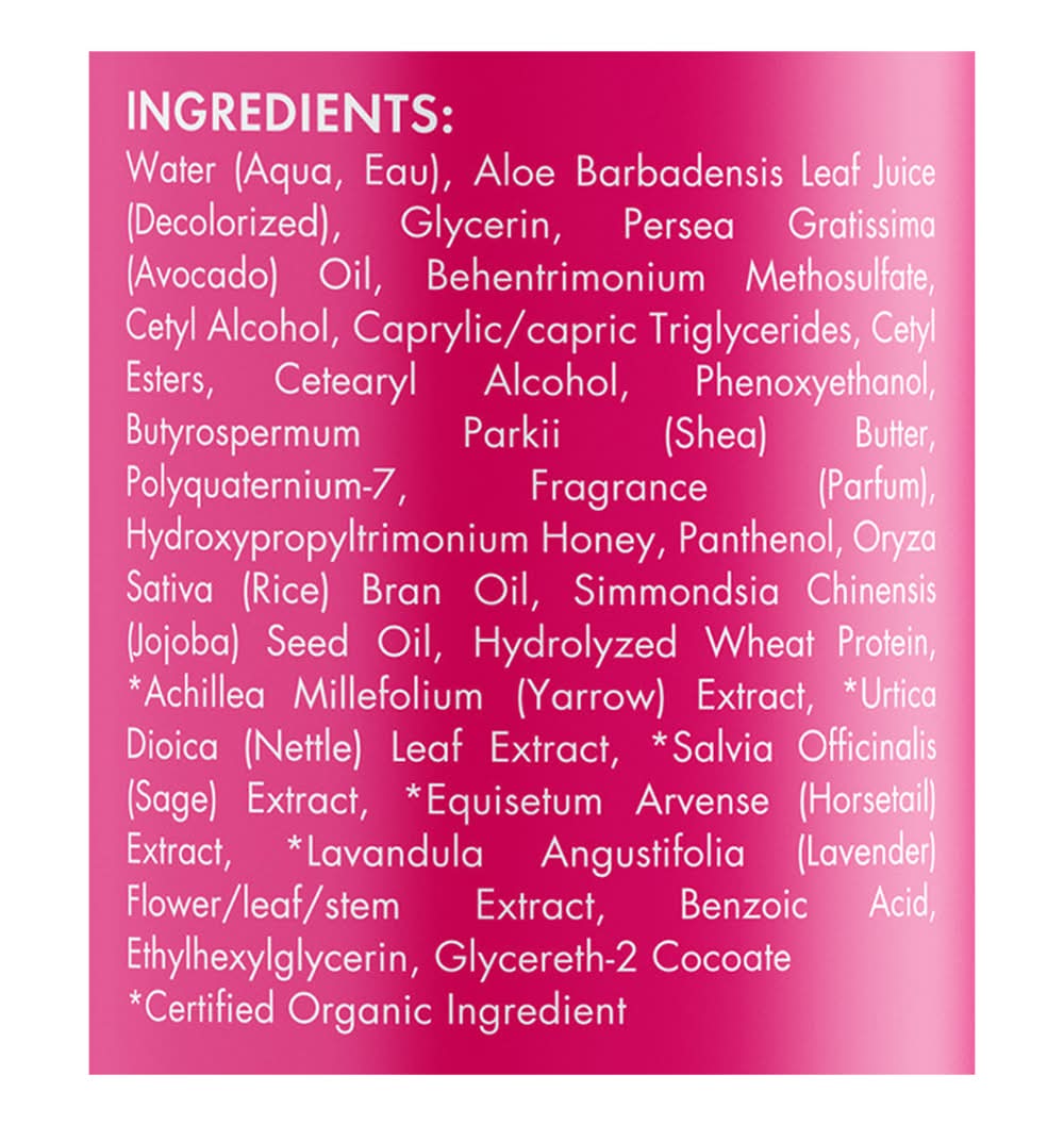 Ingredients: Water (Aqua, Eau), Aloe Barbadensis Leaf Juice (Decolorized), Glycerin, Persea Gratissima (Avocado) Oil, Behentrimonium Methosulfate, Cetyl Alcohol, Caprylic/Capric Triglycerides, Cetyl Esters, Cetearyl Alcohol, Phenoxyethanol, Butyrospermum Parkii (Shea) Buffer, Polyquaternium-7, Fragrance (Parfum), Hydroxypropyltrimonium Honey, Panthenol, Oryza Sativa (Rice) Bran Oil, Simmondsia Chinensis (Jojoba) Seed Oil, Hydrolyzed Wheat Protein, *Achillea Millefolium (Yarrow) Extract, *Urtica Dioica (Nettle) Leaf Extract, Salvia Officinalis (Sage) Extract, Equisetum Arvense (Horsetail) Extract, *Lavandula Angustifolia (Lavender) Flower/Leaf/Stem Extract, Benzoic Acid, Ethylhexylglycerin, Glycereth-2 Cocoate. *Certified Organic Ingredient Contains: Wheat Additives: Tree Nuts