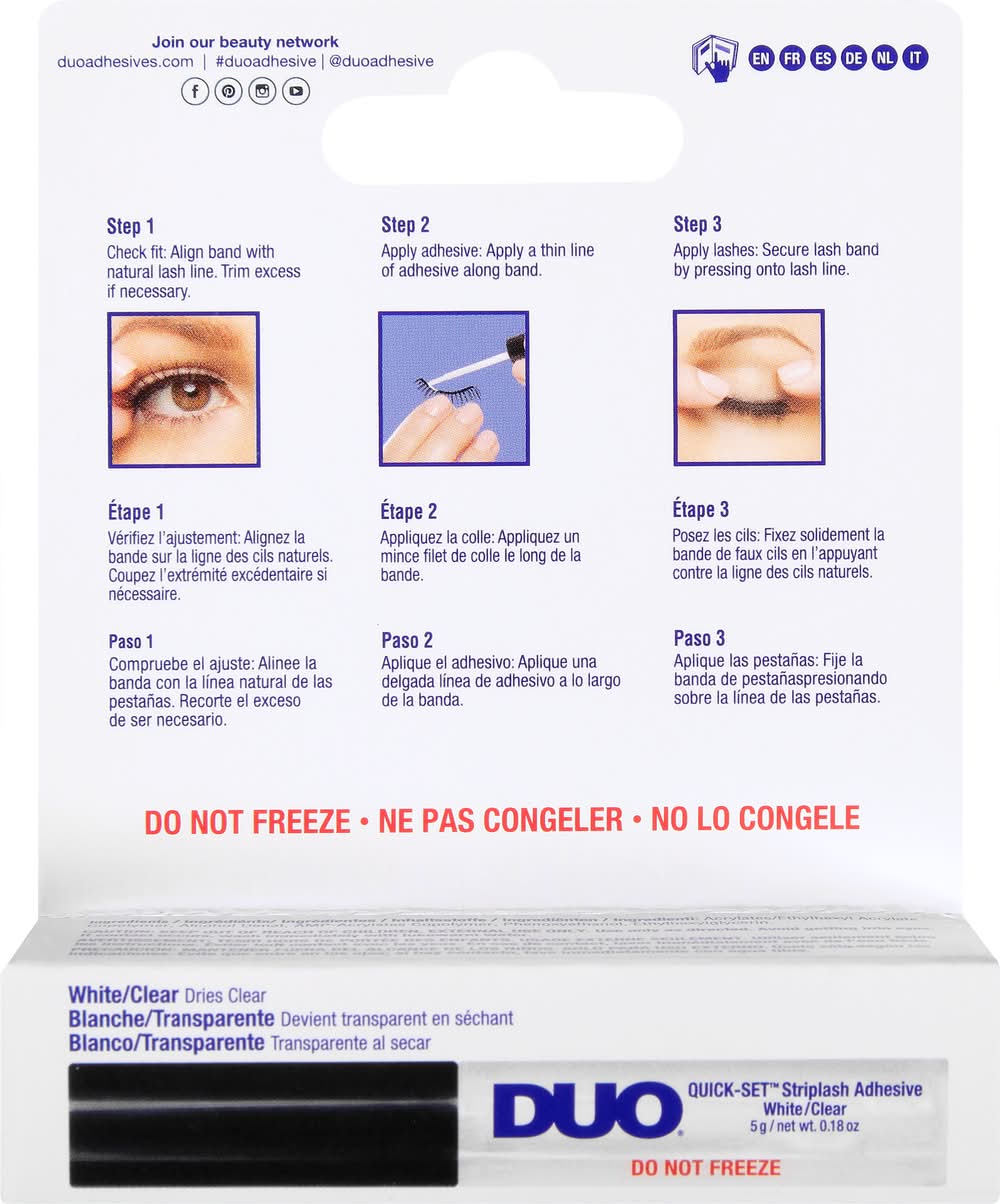 Directions for use: Step 1: Check Fit: Align band with natural lash line. Trim excess if necessary. Step 2: Apply Adhesive: Apply a thin line of adhesive along band. Step 3: Apply Lashes: Secure lash band by pressing onto lash line. Do not freeze. Good for 12 months once opened. Storage recommendation: Do not freeze.