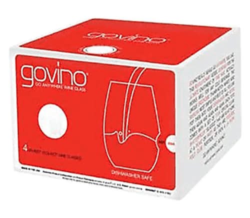 Govino Wine Glasses are crafted from a proprietary food-safe pharmaceutical grade polymer, PETG, offering durability. Each set contains four individual glasses designed for enjoying wine in various settings.