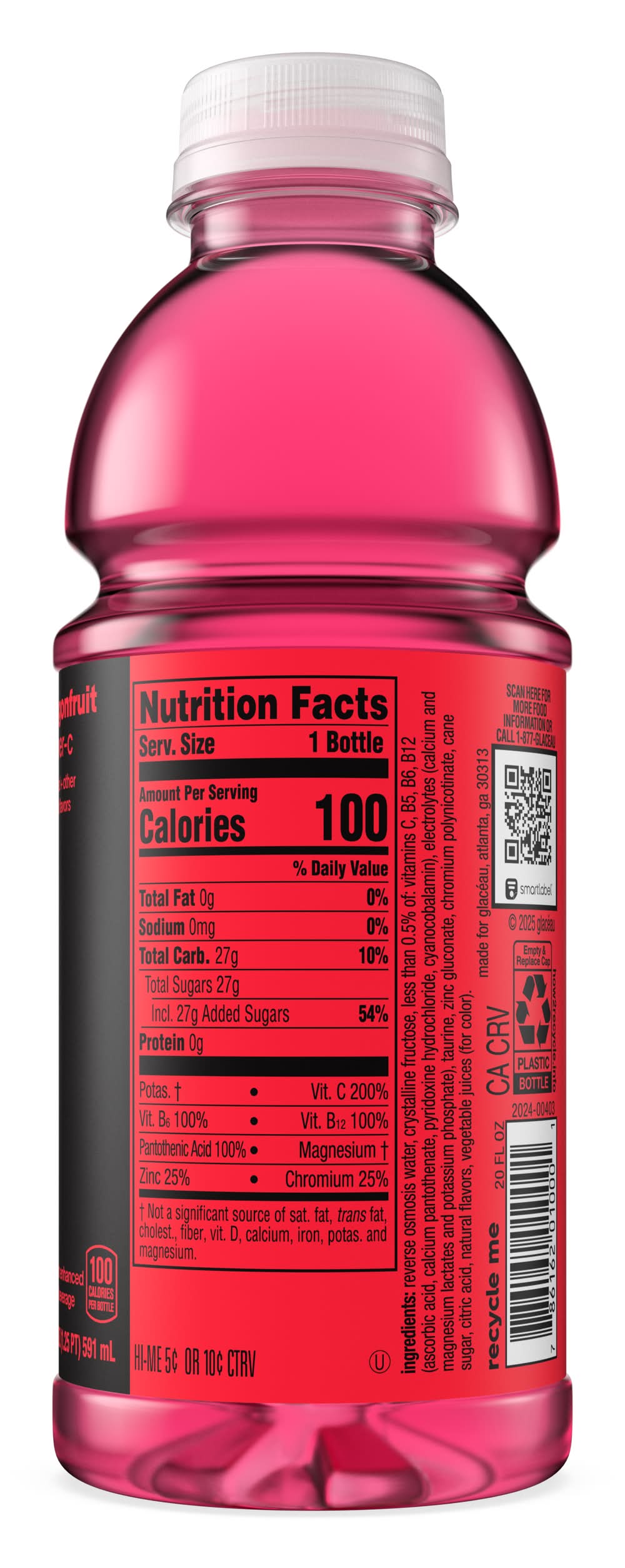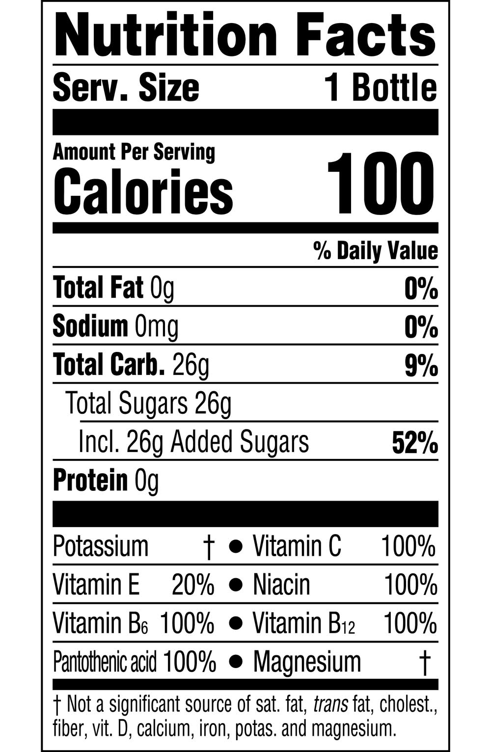 Ingredients: Reverse Osmosis Water, Crystalline Fructose, Less than 0.5 % of: Vitamins C, B5, B6, Electrolytes (Calcium and Magnesium Lactate and Potassium Phosphate), Taurine, Zinc Gluconate, Chromium Polynicotinate, Cane Sugar, Citric Acid, Natural Flavors, Vegetable Juices (for Color)., B12 (Ascorbic Acid Calcium Pantothenate Pyridoxine Hydrochloride Cyanocobalamin)