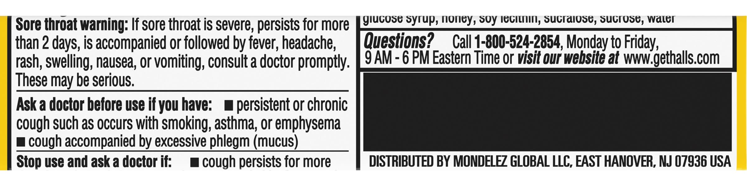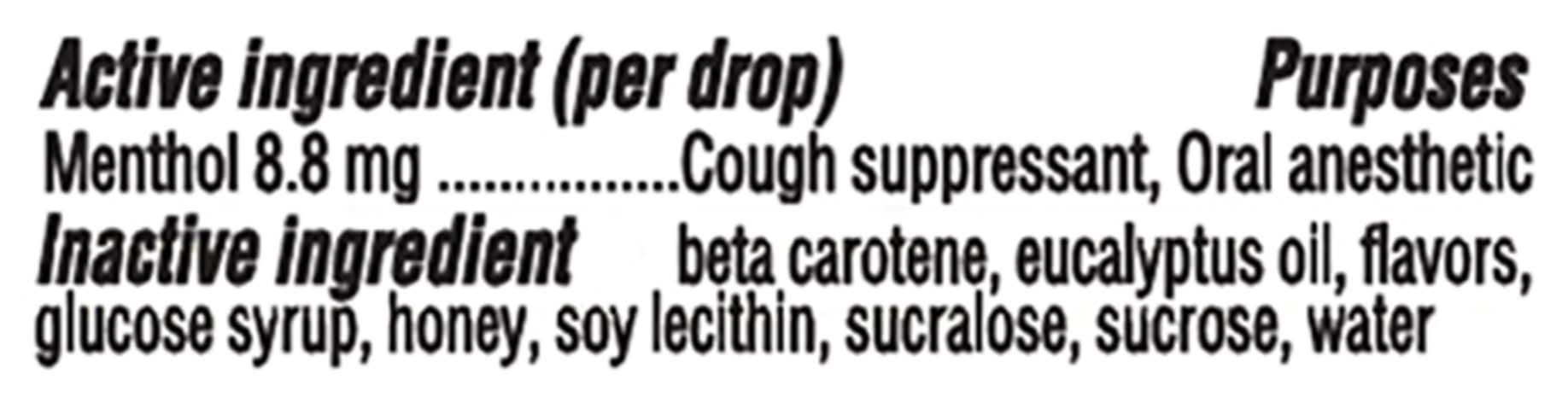 Ingredients: INACTIVE INGREDIENTS beta carotene, eucalyptus oil, flavors, glucose syrup, honey, soy lecithin, sucralose, sucrose, water CONTAINS: SOY. Contains: Soybeans