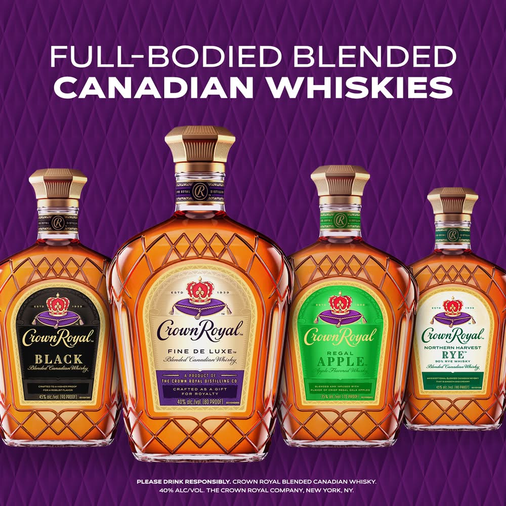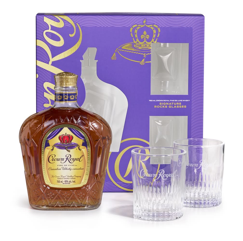 Unwind in luxury with a glass of this Blended Canadian Whisky served in our two premium Crown Royal signature rocks glasses, perfect for gifting or serving at any occasion. With a silky texture and hints of oak and sweet vanilla, our 80 proof whisky provides a refined flavor that enhances any cocktail party or celebration. Matured to perfection, our De Luxe whisky is the standard of excellence for Canadian whisky. Perfect for a classic old fashioned. Includes one 80 proof 750 mL bottle of Blended Canadian Whisky and two signature rocks glasses. Please drink responsibly. • Pack size: 3 • Alcohol by volume: 40% • Packaging: Reusable