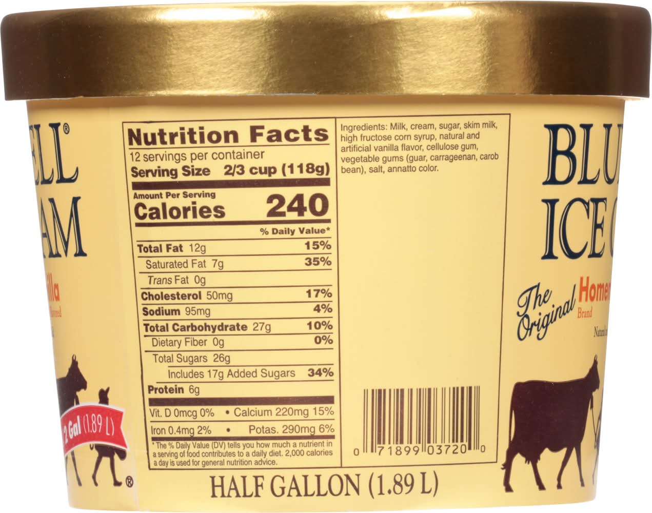 Ingredients: Milk, Cream, Sugar, Skim Milk, High Fructose Corn Syrup, Natural and Artificial Vanilla Flavor, Cellulose Gum, Vegetable Gums (Guar, Carrageenan, Carob Bean), Salt, Annatto Color Contains: Milk, Corn
